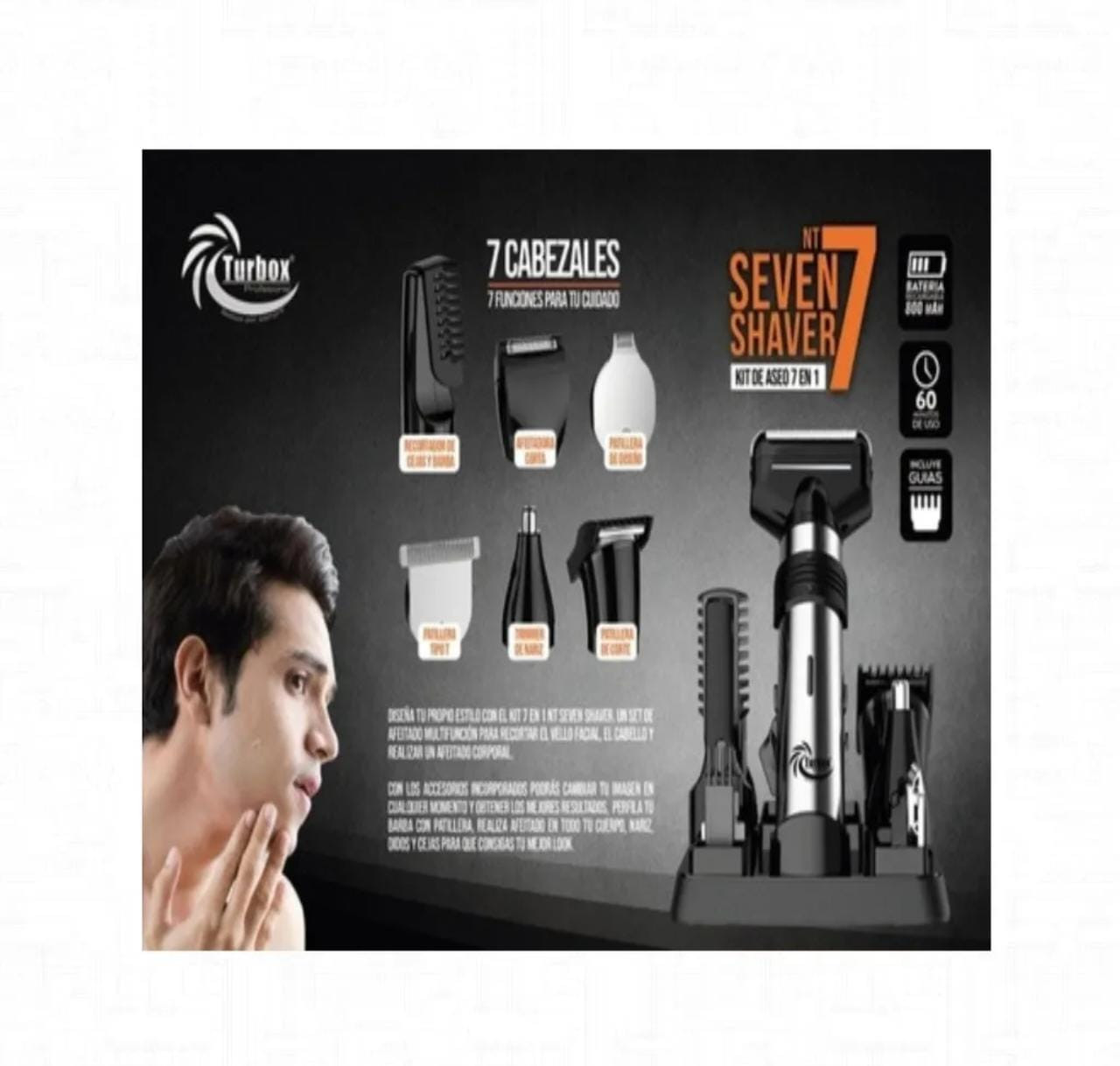 Diseña tu propio estilo con el KIT 7 EN 1 SEVEN SHAVER. Un set de afeitado multifunción para recortar el vello facial, el cabello y realizar un afeitado corporal, Con los accesorios incorporados podrás cambiar tu imagen en cualquier momento y obtener los mejores resultados, perfila tu barba con patillera, realizar afeitado en todo el cuerpo, nariz, oídos y cejas para que consigas tu mejor look.