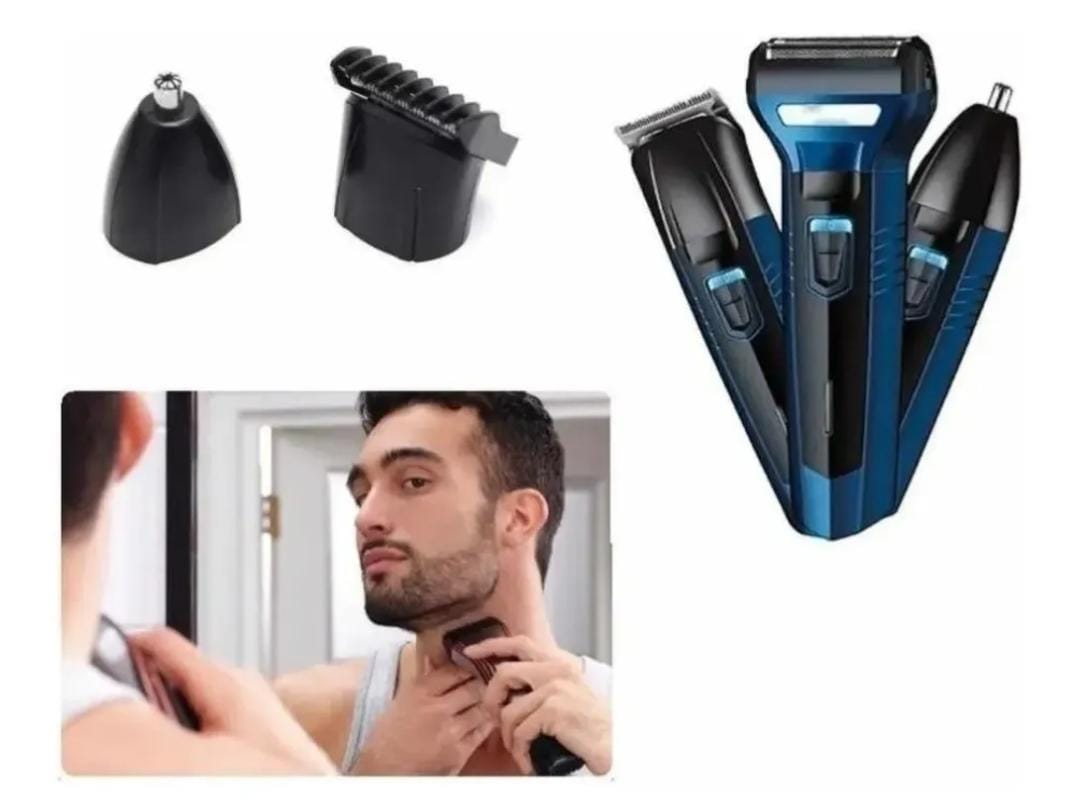Máquina de afeitar eléctrica de 3 cabezas intercambiables. Tiene 3 funciones diferentes, está equipada con los accesorios, la cual hace la afeitada más efectiva y eficiente, sin dolor, sin у quemaduras y sin irritaciones para un resultado final de una barba y bigote elegante y con diseño, y una experiencia de afeitado profesional, además cuenta con un accesorio para el pelo de la nariz y oídos у