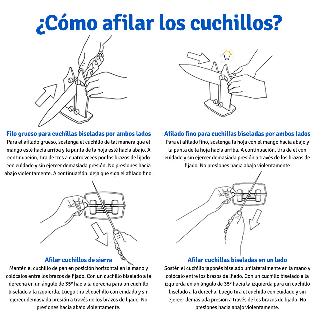 - Modo de uso: Solo debes tomar el afilador firmemente abrir un poco con las manos los brazos plásticos y luego simplemente afilar en una sola dirección el cuchillo haciendo una leve presión y deslizando. Si el cuchillo está muy desafilado se pasa varias veces por las placas de tungsteno hasta tener el resultado deseado.
