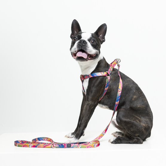 Este set X2 de arnés y correa está elaborado en poliéster sublimado. Sus colores y formas evocan la diversión de muchas aventuras junto a tu amigo peludo. Los herrajes están elaborados en zamak, la reata es suave con el pelaje, brindando confort y seguridad.
