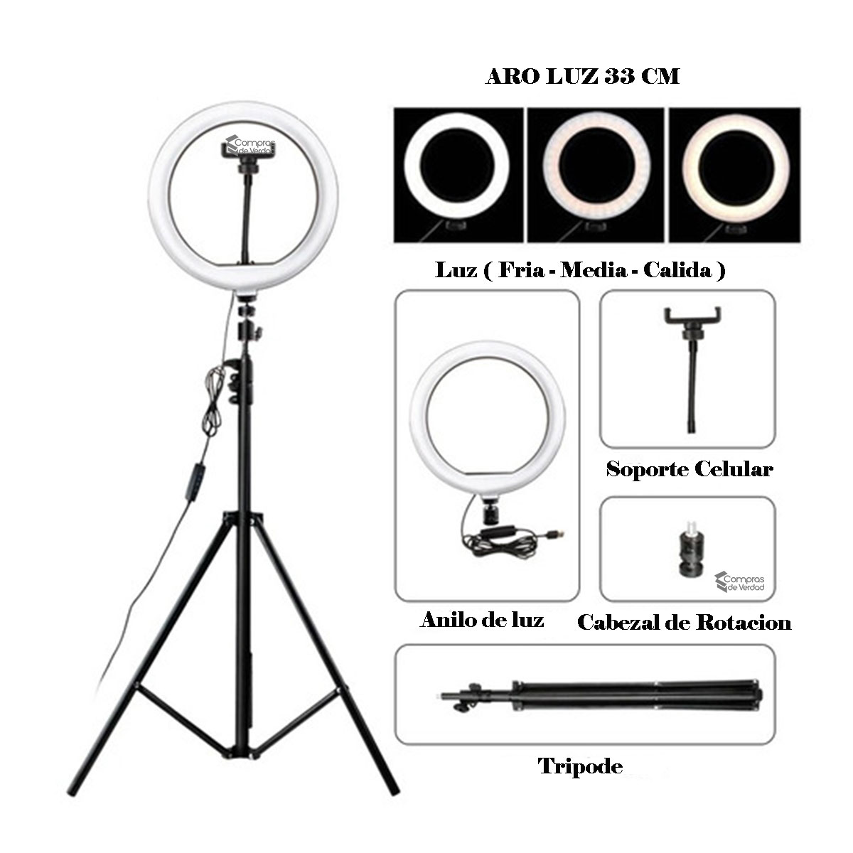 Aro De Luz Led 33 Cm + Tripode 2.1m Altura + Soporte Celular