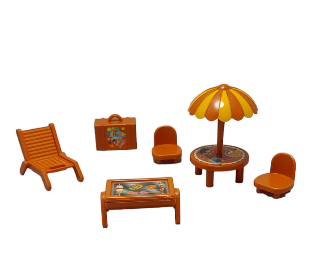 - Accesorios incluidos: mesa, 3 sillas, 2 maletas, parrilla, deslizadero, 1 avión, 2 cabellos, 6 vestidos, 2 muñecas