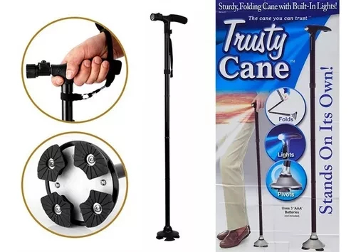 El Baston Trusty cane con Linterna led es una poderosa herramienta para apoyarse y desplazarse cuenta con sistema antishock, 4 puntos de soportes, es totalmente portátil , fácil de desarmar guardar y transportar. La poderosa linterna le permite andar durante cualquier hora de la noche.