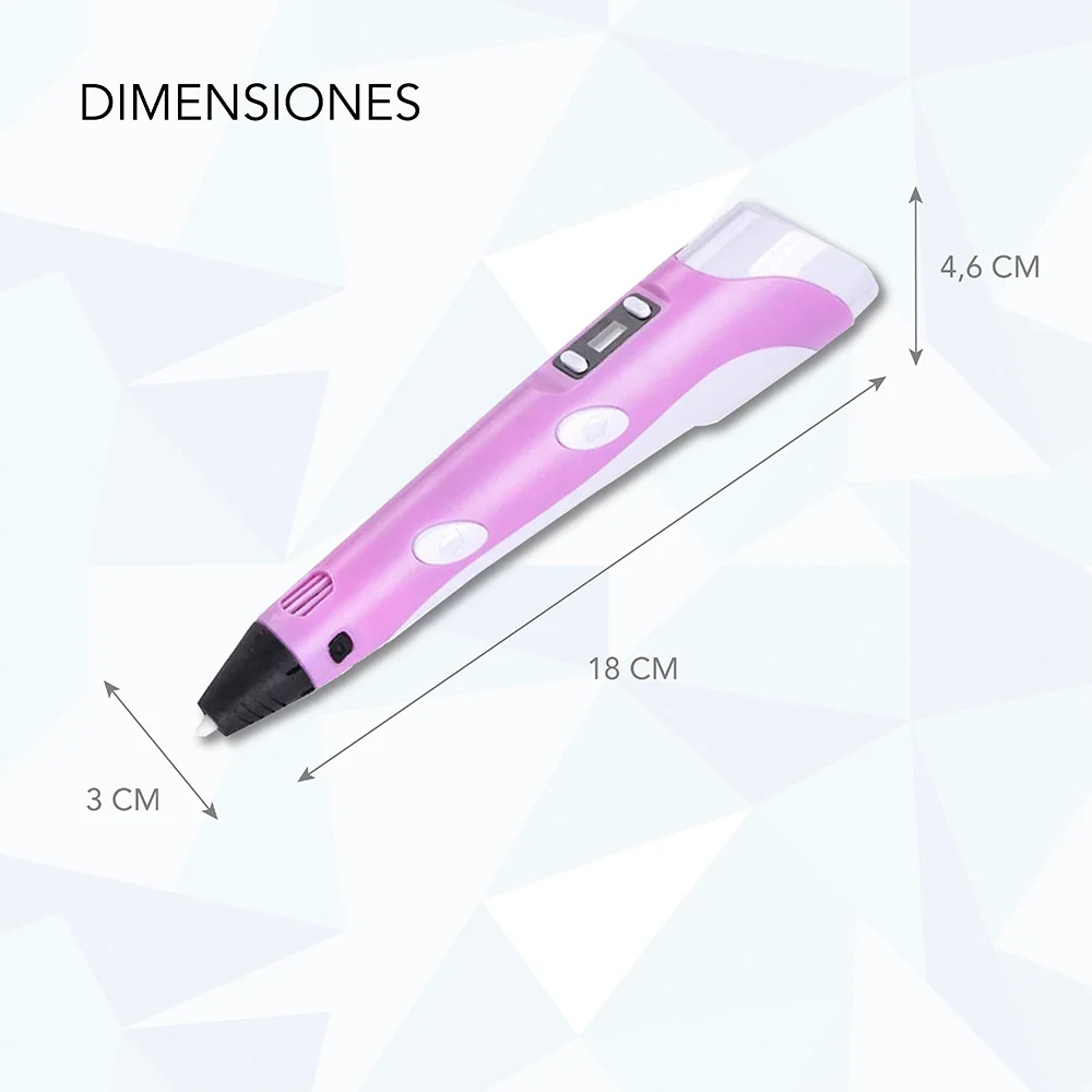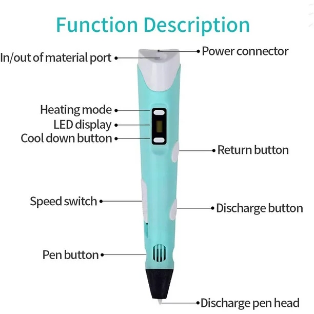 Pantalla LCD de temperatura ajustable con botones para cargar / descargar y ajustar la temperatura y la velocidad. La velocidad prometida puede satisfacer todas sus necesidades. Puede elegir el modo apropiado según el nivel de pintura. Cuando disfruta dibujando un modelo 3D, la pantalla LCD le permite monitorear la temperatura y la velocidad de extrusión del material.Fuente de alimentación del puerto USB El lápiz 3D funciona con USB y se puede cargar con energía móvil, computadoras y computadoras portátiles, lo que lo hace más conveniente para dibujar en interiores y exteriores. (Asegúrese de que la corriente es 5V / 2A) .Puedes usarlo en casa, escuela, clase de dibujo de arte.