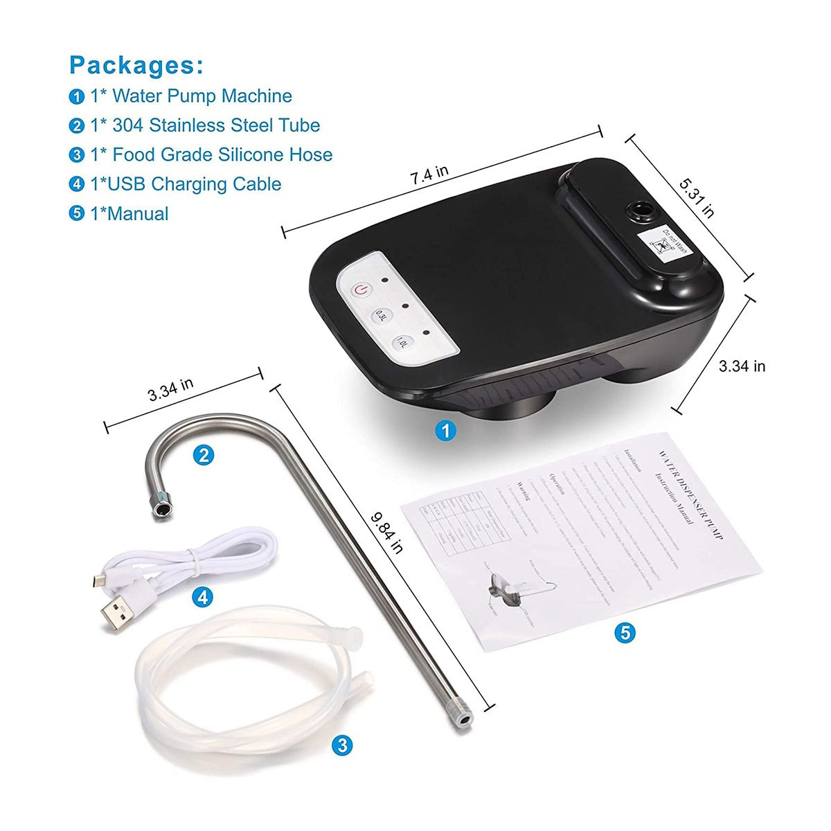 Esta bomba de botella de agua está hecha con material de alta calidad sin BPA. Manguera de silicona de grado alimenticio, acero inoxidable 304, plástico ABS de alta densidad, no tóxico y sin olor.