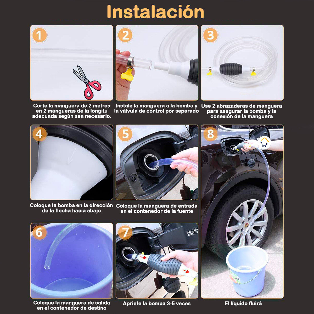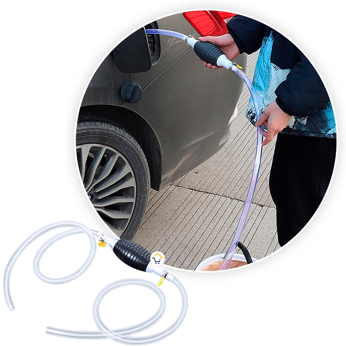 - Bomba de mano de sifón para gasolina, ideal para transferencia de gas de emergencia. El líquido que estás tratando de deshacerse tiene que ser más alto que el cubo en el que estás fluyendo. El extremo de montaje debe mantenerse dentro del líquido no solo en la superficie.