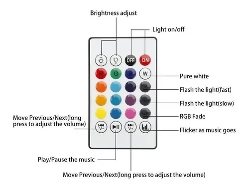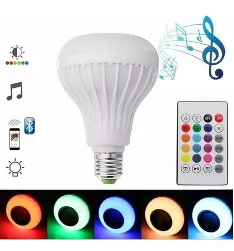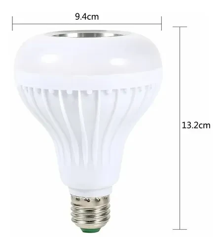 – Interfaz E27 @ – Voltaje de trabajo AC100V-240V / 50-50Hz @ – Potencia 12W @ – Potencia LED 7W @ – Potencia de altavoz 3W @ – Respuesta del altavoz 3W @ – Respuesta de frecuencia 135 Hz a 15KHz @ – Versión inalámbrica 4.2 @ – Configuración de soporte A2DP @ – Gama de radio 10m (33ft) @ – Color de luz RGB 16 color con el mando @ – Amplificador Clase D @ – Gama de radio: 10m (33ft) @ – Entrada de señal: Bluetooth @ – Tamaño: L x W x H: 9,4 x 9, 4 x 13 cm @El paquete incluye: @ – 1 lámpara LED con parlante y bluetooth @ – 1 control remoto (incluye batería CR2032) @@@ Funciones del control: @ – Cambia a 13 colores incluido el blanco