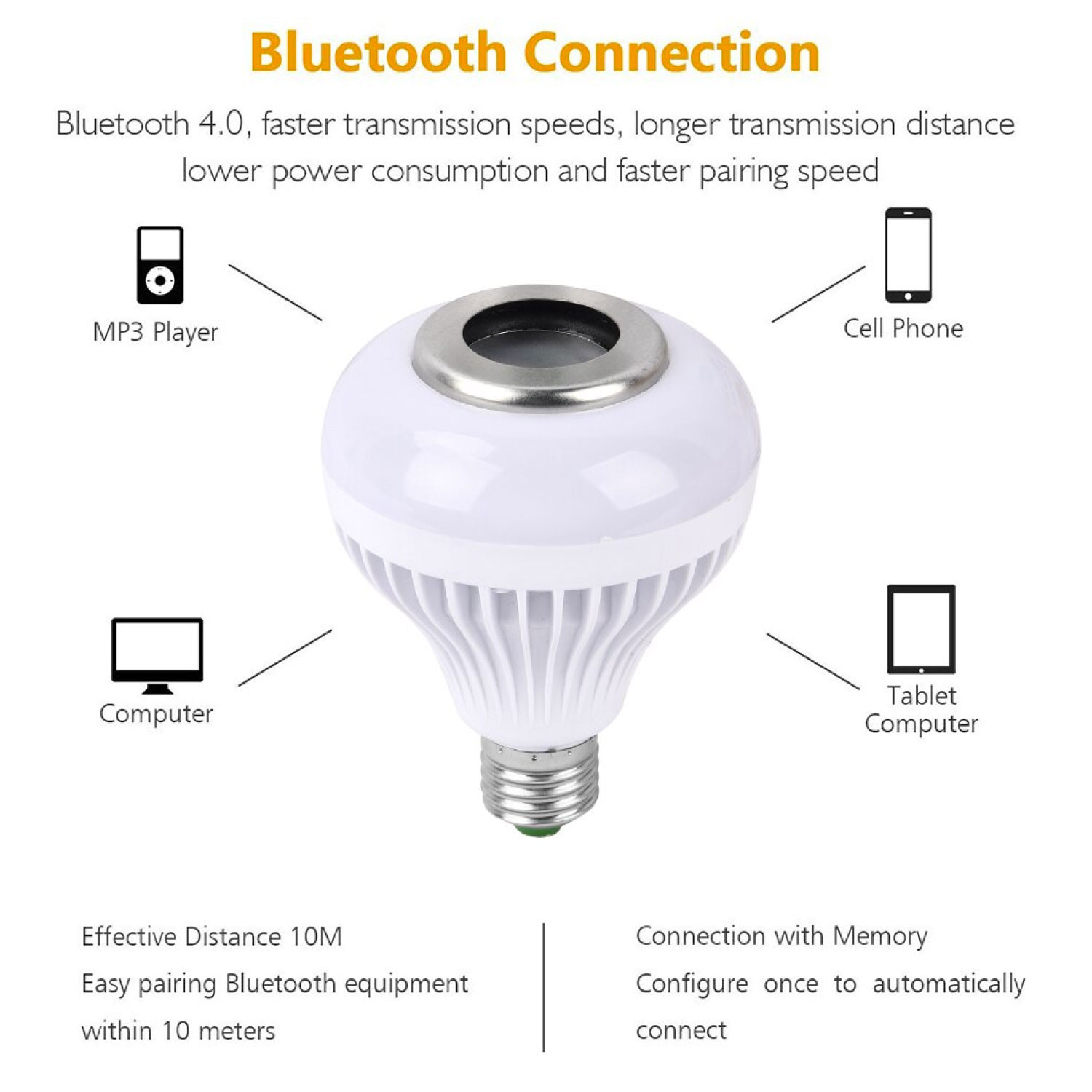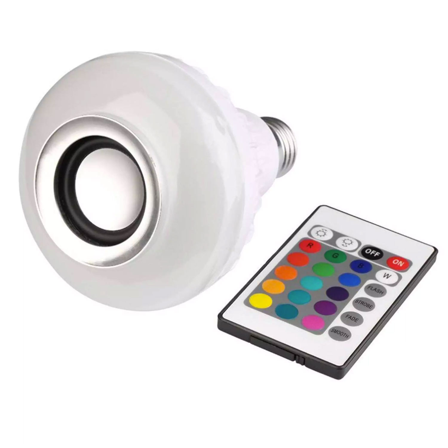Novedoso bombillo LED con función de bluetooth para convertir en parlante y poner música; tiene un control para pasar la canción, subir y bajar volumen, además, de elegir color de iluminación entre 16 tonos diferentes.