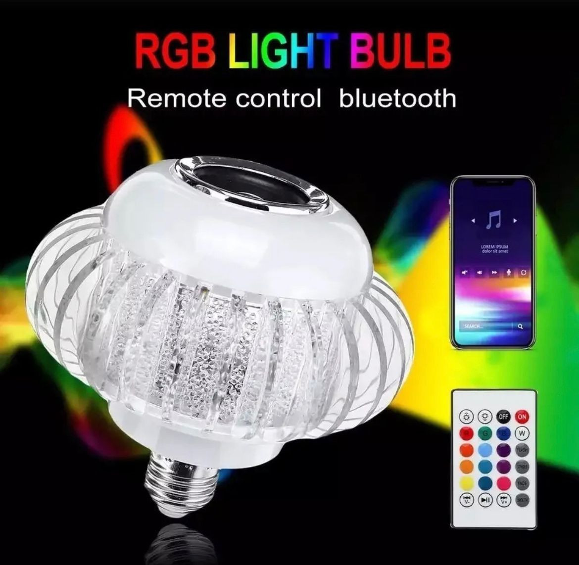 Bombillo led parlante bluetooth, con este dispositivo puedes escuchar música, apagar o encendre la luz con el control remoto y cambiar los diversos colores de luz