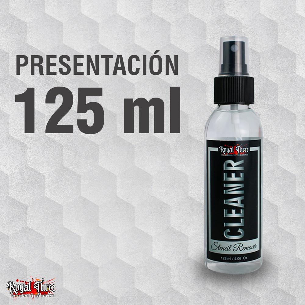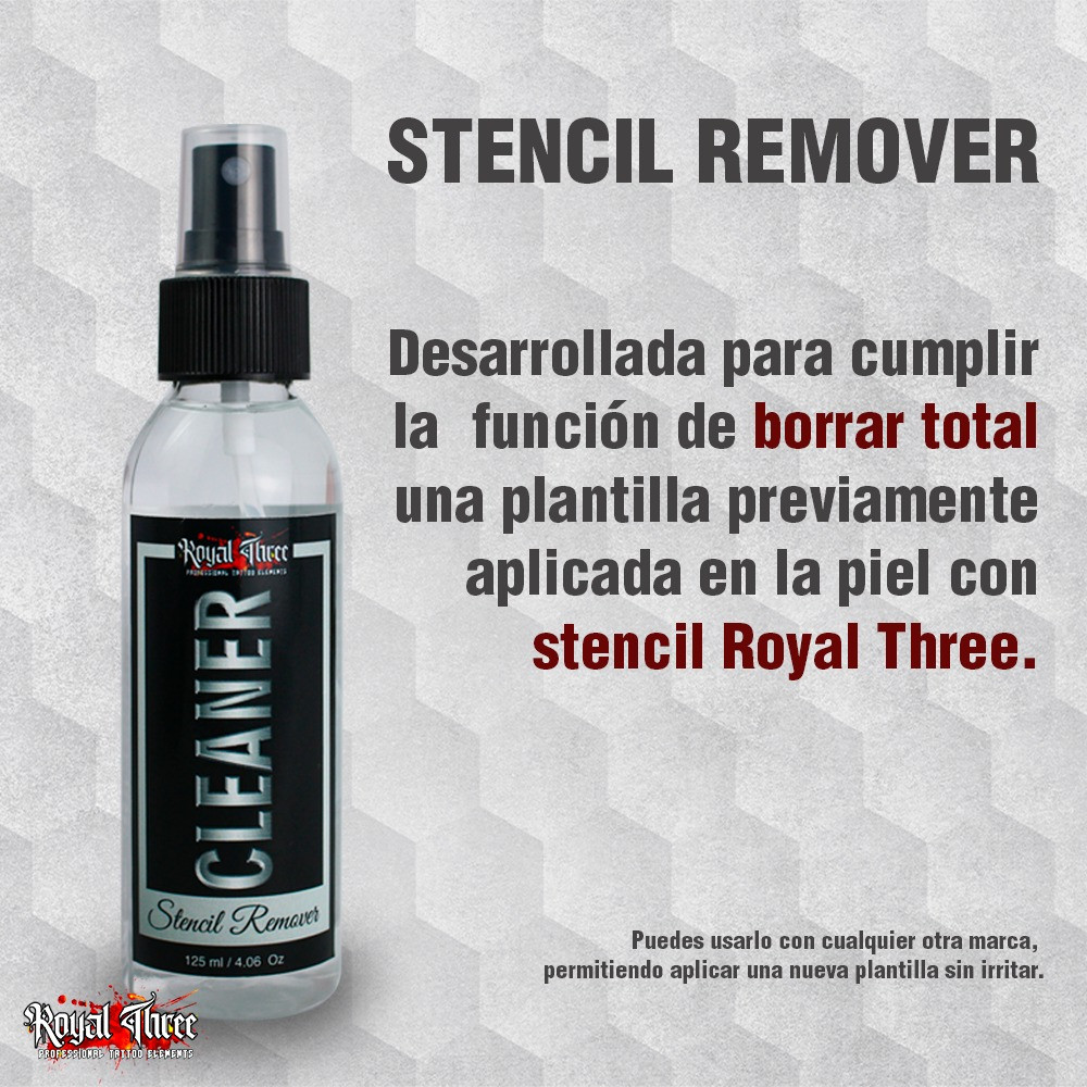 La solución STENCIL CLEANER ha sido desarrollada para cumplir la función de borrar total o parcialmente una plantilla previamente aplicada en la piel con stencil Royal Three o cualquier otra marca, permitiendo aplicar una nueva plantilla sin irritar.