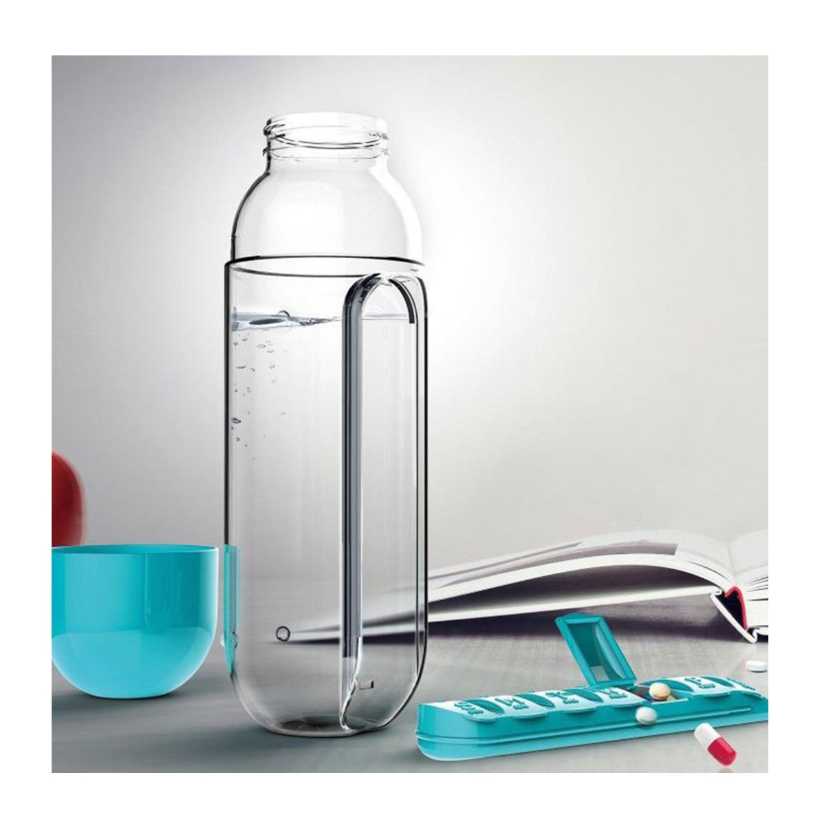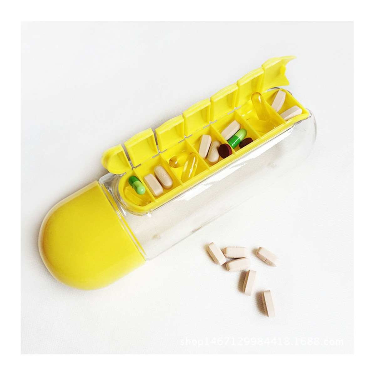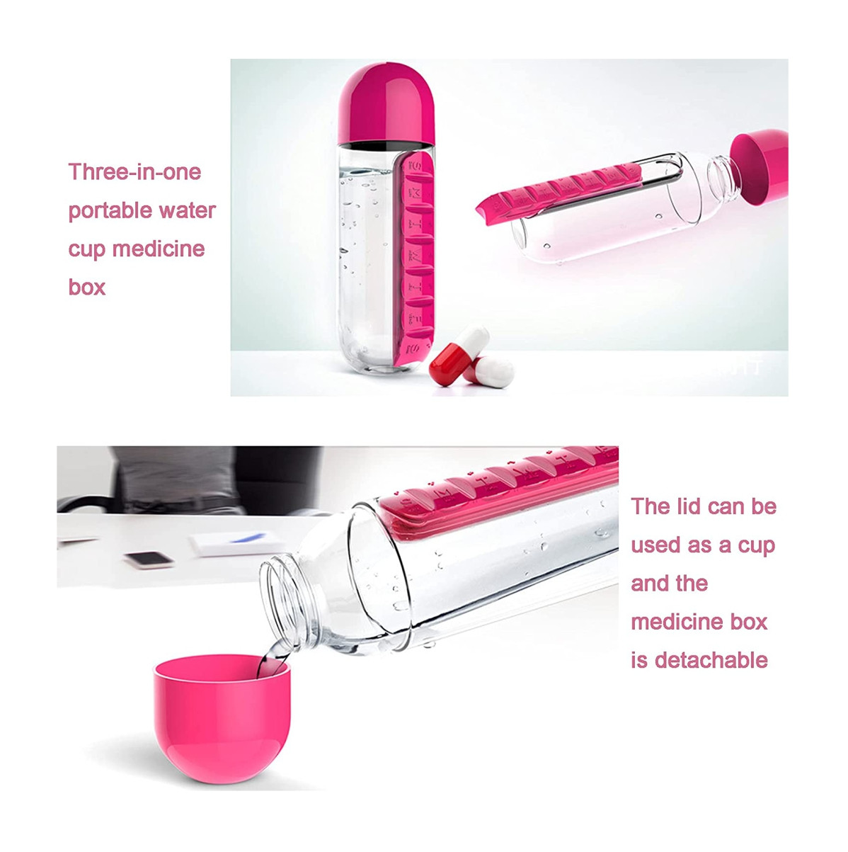 Con este organizador de botellas de píldoras puedes estar seguro de que ya no olvidarás tomar tus vitaminas y pastillas. Botella de agua organizadora de pastillas, conveniente para llevar y usar cuando sales, el pastillero se puede quitar fácilmente. Es un buen ayudante para el hogar, la oficina y los viajes al aire libre.