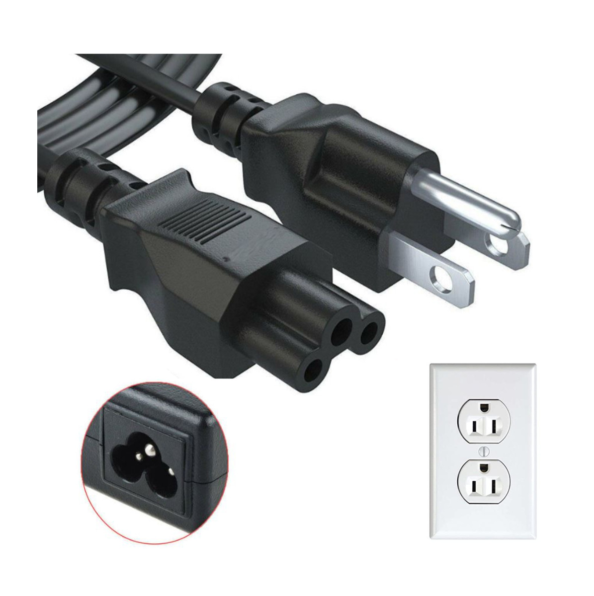 Cable de alimentación (Interlock) o conector tomacorriente tipo trébol de 1,5 m de largo, con cable calibre 18 AWG, en color negro. Se utiliza comúnmente en monitores y laptops.