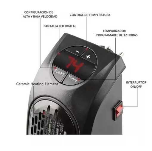 Tiene la capacidad de subir la temperatura ambiente de cualquier espacio hasta de 23 metros cuadrados ya sea habitación, oficina, baño, garaje o sala de estar, entre otros. Puedes elegir entre dos velocidades de aire y programar el tiempo de funcionamiento como un temporizador que puede ir desde 1 hora hasta 12 horas. También puedes graduar la temperatura desde 15º C hasta 32º C, todo esto desde los botones manuales del calentador o desde el control remoto.