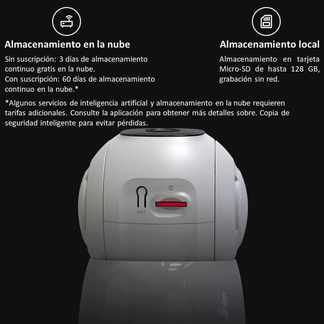 Almacenamiento de vídeo: almacenamiento en la nube, tarjeta Micro SD local (hasta 128 GB) y memoria del teléfono móvil.