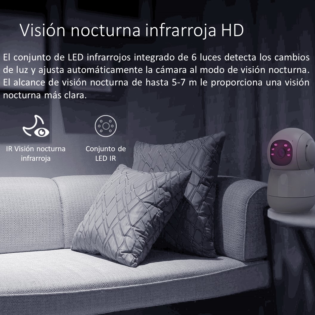 R: Las perlas de la lámpara infrarroja incorporadas hacen que la cámara solo muestre algunas luces rojas tenues cuando se activa la visión nocturna, pero la calidad de la imagen sigue siendo clara en un entorno sin luz.
