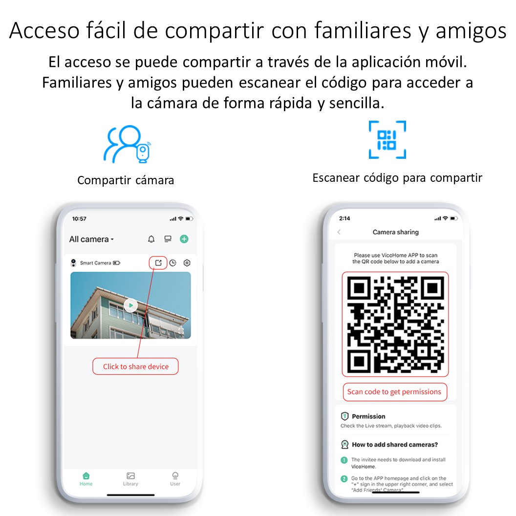 R: Abra la aplicación y seleccione su cámara en la página de inicio. Haga clic en el botón Compartir en la página de inicio o en «Compartir» en la configuración de la cámara para ingresar a la página para compartir y luego haga clic en «Invitar» para generar un código QR. Tus amigos ahora pueden obtener algunos de los derechos de acceso escaneando el código QR en su teléfono.