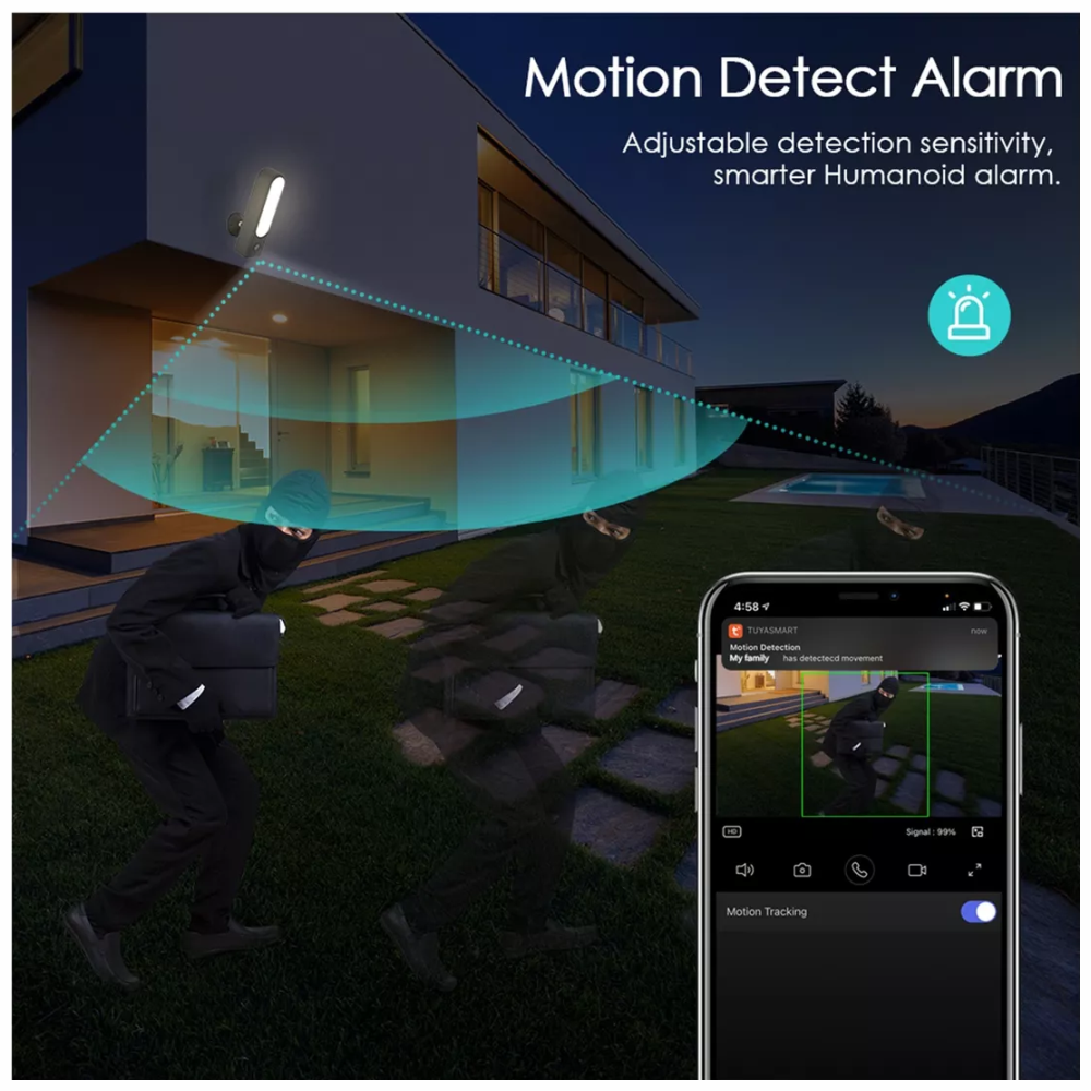 Reflector con sensor de 5000 lúmenes con ángulo de visión de 110 °, función de visión nocturna infrarroja de Ultra-sensitivo 1080P, que le proporciona una mejor calidad de visión nocturna HD y hasta 15M de distancia de visión nocturna. Se pueden configurar tres modos de iluminación a través de la aplicación, más eficiente energéticamente y duradero. Cuando hay movimiento, la cámara puede encender el reflector que le transmitan la alerta. Adecuado para puertas de apartamentos, aparcamientos, parques, pasillos, almacenes, balcones y otros lugares.