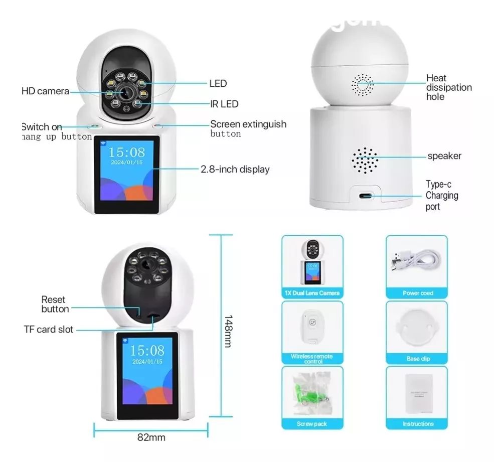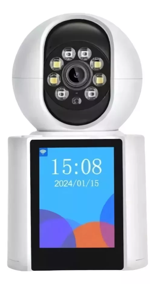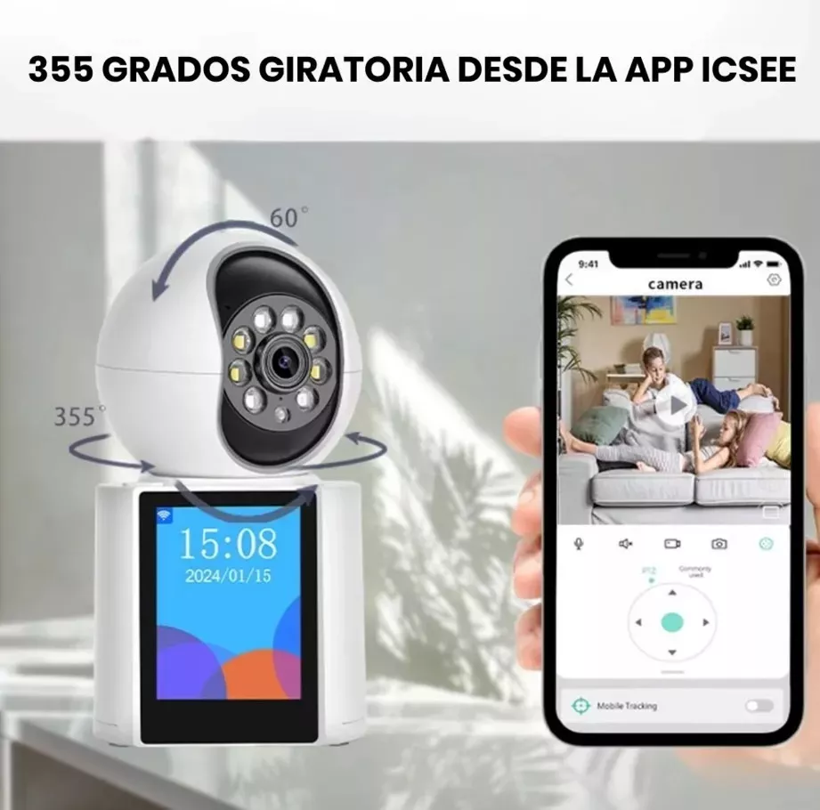 La cámara de seguridad WiFi con video llamada y pantalla es una solución avanzada para la vigilancia del hogar o la oficina. Ofrece una imagen HD nocturna en color gracias a su tecnología infrarroja, permitiendo una vigilancia clara y detallada incluso en la oscuridad. Esta cámara inalámbrica se conecta a tu red WiFi para un fácil monitoreo remoto a través de tu dispositivo móvil. Con un ángulo de rotación de 355°, detección de movimiento, y audio bidireccional, puedes mantenerte en contacto y monitorear cualquier actividad en tiempo real. Además, cuenta con una sirena de alarma para disuadir a intrusos y un micrófono y altavoz integrados para comunicación directa.