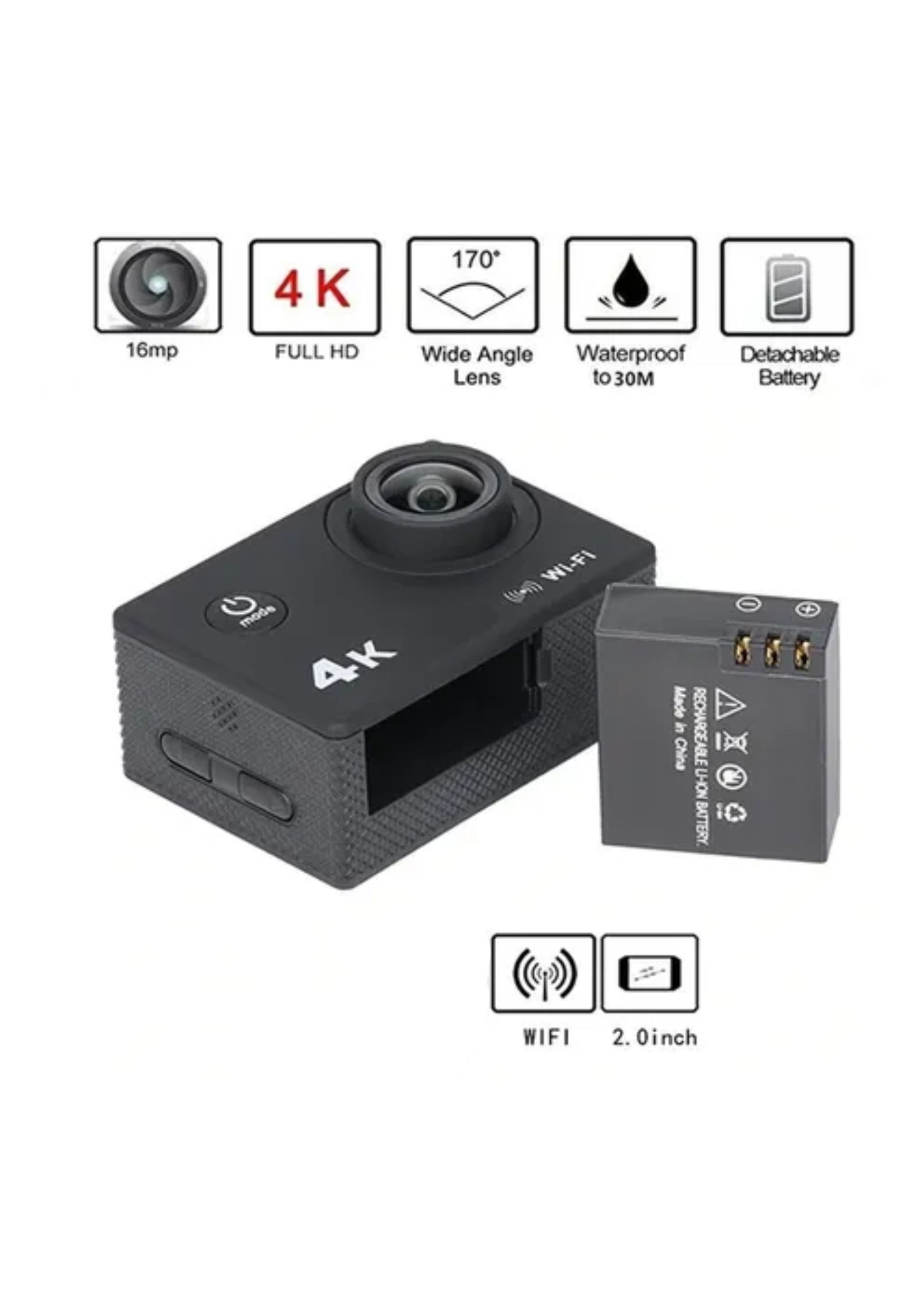 NUEVA CAMARA DE DEPORTES VIDEO ACTION CAM 4K ULTRA HD WIFI + ACCESORIOS @PANTALLA 2″ @@Pantalla LCD LTPS de 2.0 pulgadas. @La lente gran angular de 170 grados ofrece un campo de visión más amplio y puede tomar en más alrededores. @4K resolución de vídeo ultra HD y resolución de la foto de 16M, le ayudan a obtener más claro, videos e imágenes reales y naturales. @Carcasa impermeable permite sumergir hasta 30 metros bajo el agua, ideal para los amantes de los deportes acuáticos. @Admite la función WIFI. @Admite la tarjeta Micro SD hasta 64G @@Especificaciones: @• LCD: LTPS de 2.0 pulgadas @• Lente: 170° + lente gran angular HD @• Impermeable: hasta 30m@• Resolución del vídeo grabado: 4K (3840 * 2160) 24fps, 1080FHD (1920 * 1080) 30fps, 1080P (1440 * 1080) 30fps, 720P 1280 * 720 30fps, WVGA (848 * 480) 30fps, VGA (640 * 480) 30fps, QVGA (320 * 240) 30fps @• Formato de video: MOV @• Resolución de fotos: 16M (4640 * 3480), 12M (4032 * 3024), 10M (3648 * 2736), 8M (3246 * 2448), 5M ( 2592 * 1944), 3M (2048 * 1536), 2M (1920 * 1080), 1.3M * 960), VGA (640 * 480) • Formato @comprimido de los vídeos: H.264 @• Almacenamiento: Memoria Micro SDHC Clase 10 16GB -32GB-64GB (no incluida) @• Modo de disparo: Toma única / Disparador automático (3s / 5s / 10s / 20s)/Disparo Continuo @• Sistema de teléfono de la ayuda de WIFI: ISO 6.1 y arriba, androide 4.0 y arriba
