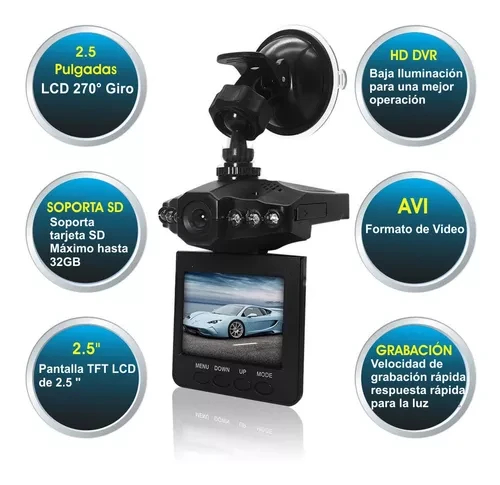 Cámara para Carro HD DVR 1080P, pantalla de 2,5 pulgadas giratoria hasta 270 grados, visión nocturna, ranura expandible, fotografías 3mp, detección de movimiento, puerto USB, etc. Obtén pruebas en accidentes de tránsito, incidentes menores, infracciones y robos en tu vehículo. Monitorea fácilmente en carros particulares y públicos como taxis, buses o flotas. Si deseas grabar un viaje largo, puedes conectarla directamente al encendedor del carro y grabar lo que quieras (requiere conexión al encendedor del vehiculo para su óptimo funcionamiento). Sácale provecho a su potente cámara con grabación a 1080p HD, para grabar a largas distancias, sensor CMOS y 6 LEDS infrarrojos para visión nocturna o en escenas con contraluz. No te perderás ni un solo detalle en tus grabaciones.