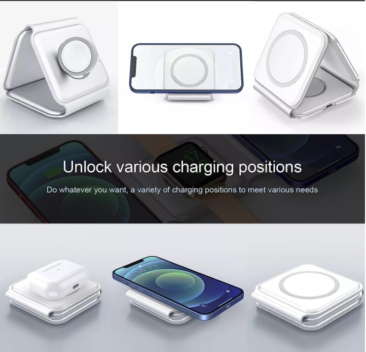 Diseño ajustable y Portable – El cargador hace que el plegado de 180 ° sea suave, la almohadilla de carga inalámbrica se convierte en un soporte para teléfono en segundos. Al cargar, el teléfono para ver películas se coloca horizontal y verticalmente para chatear. La placa de carga está cubierta con un dispositivo magnético, que no se deslizará incluso si se agita. Se puede utilizar en la oficina, el hogar, la mesa de comedor y el dormitorio.