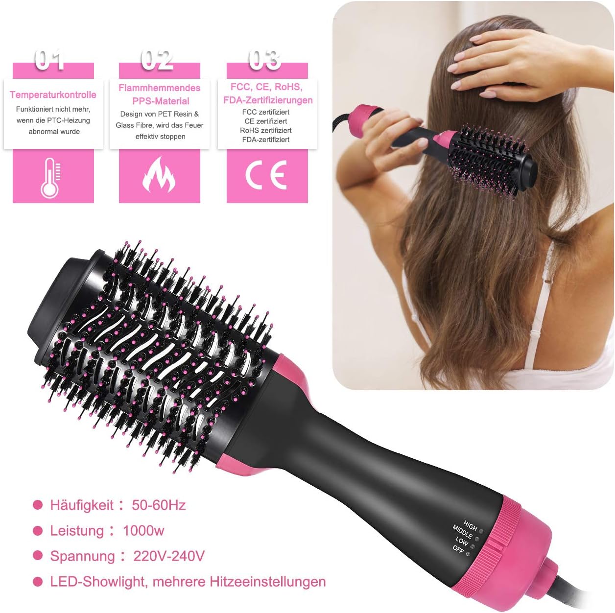 • Ajuste perfectamente ajustable: 3 modos de temperatura (frío/bajo/alto), cable de alimentación giratorio a través de 360 grados. Cepillo de volumen ovalado, ofrece la cantidad justa de calor y flujo de aire para secar tu cabello en minutos.