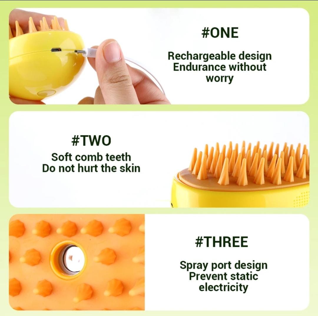 ¡Una solución de cuidado eficaz para mascotas felices en su hogar! El cepillo 3 en 1 resuelve los tres problemas del pelo de las mascotas, la limpieza con vapor de las mascotas, el masaje de las mascotas e increíble reducción de la muda, ¡dígale adiós al cabello en su hogar y dé la bienvenida a un espacio vital más limpio y sin pelo!