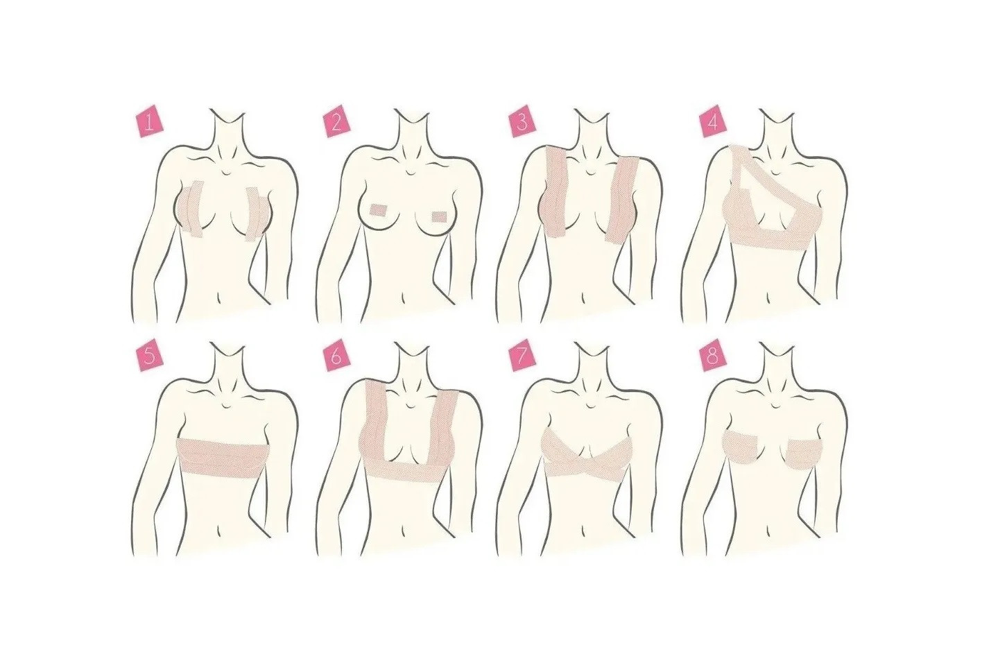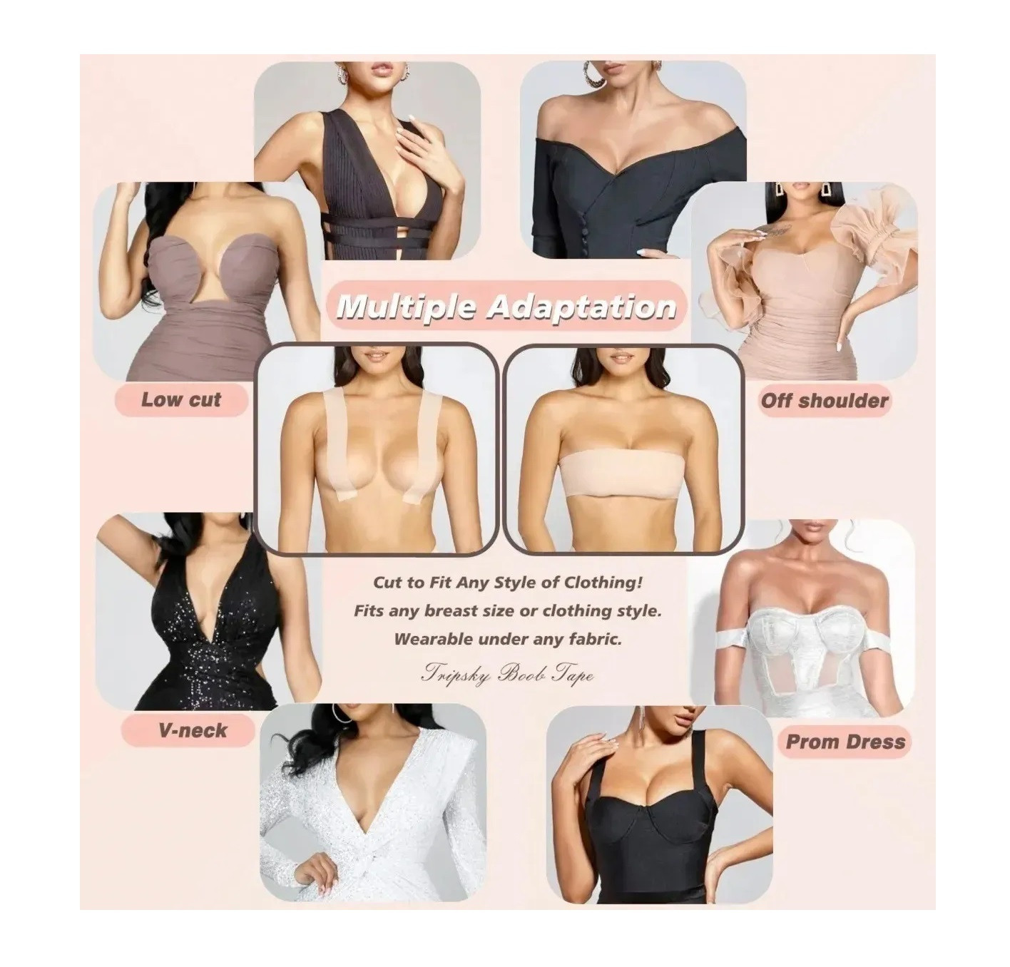 *Contra el agua, perfecto para llevar debajo del traje de baño. @*Tejido de algodón elástico. @*Talla única. @@Modo de empleo: @@1. Corta la cinta al tamaño deseado y aplica sobre la piel limpia y seca, sin aceites ni cremas. @2. Es ideal para blusas o vestidos de corte bajo, eventos especiales. @3. Hay varias formas de colocar a gusto y dependiendo de la prenda y la ocasión, se incluye una imagen de referencia.