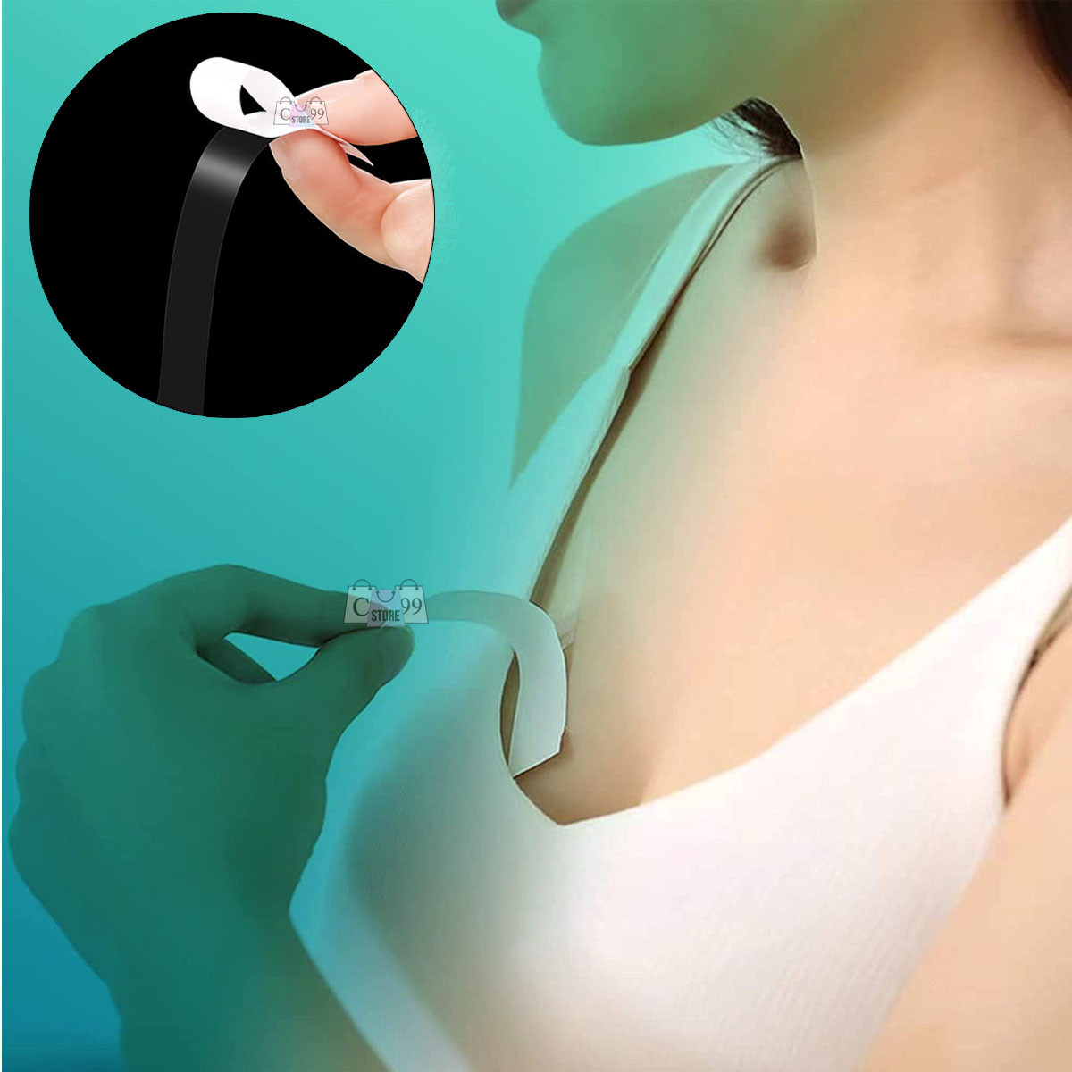 Instrucciones: asegúrate de que el área de la piel esté limpia, seca y libre de humedad. La cinta no funciona con piel húmeda o grasienta. Comprueba dónde quieres colocar la prenda. Retira la cinta trasera blanca de 1 lado de la cinta. Presiona este lado sobre la piel y frota firmemente. Ahora retira el lado exterior del respaldo blanco protector. Presiona la ropa firmemente en su lugar durante unos segundos. Repetir esto en otras áreas donde sea necesario. La ropa se mantendrá en posición durante horas.