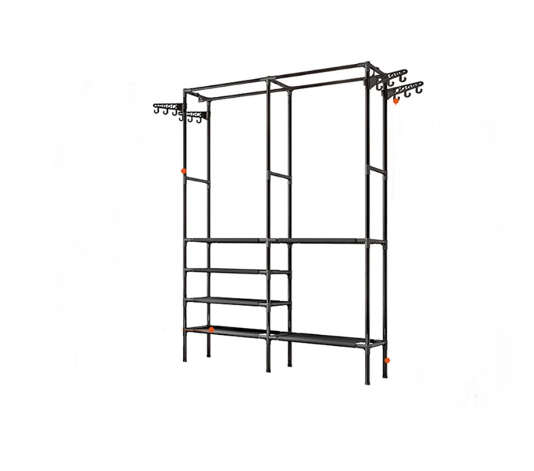 Ropero Armario Closet Perchero Organizador Ropa de 2 cuerpos, organiza tu ropa de forma elegante con este ropero armable, tiene 2 barras donde se puede colgar la ropa de forma ordenada, tiene 6 espacios para colocar lo que uno quiera como ropa, zapatos, cajas, etc. Es muy resistente gracias a sus tubos de metal y las uniones o conectores de plástico. Medidas: 160 X 36 X 173 CM Cada nivel tiene capacidad para sostener un peso de hasta 7k. Las barras para colgar soportan hasta 15k, lo que garantiza que tu ropa se mantenga estable. A cada lado tiene adicional 1 colgador de ropa. Montaje fácil: No requiere herramientas, simplemente conecta los tubos en los conectores de plástico. En la parte del piso se puede aprovechar y colocar más cosas.