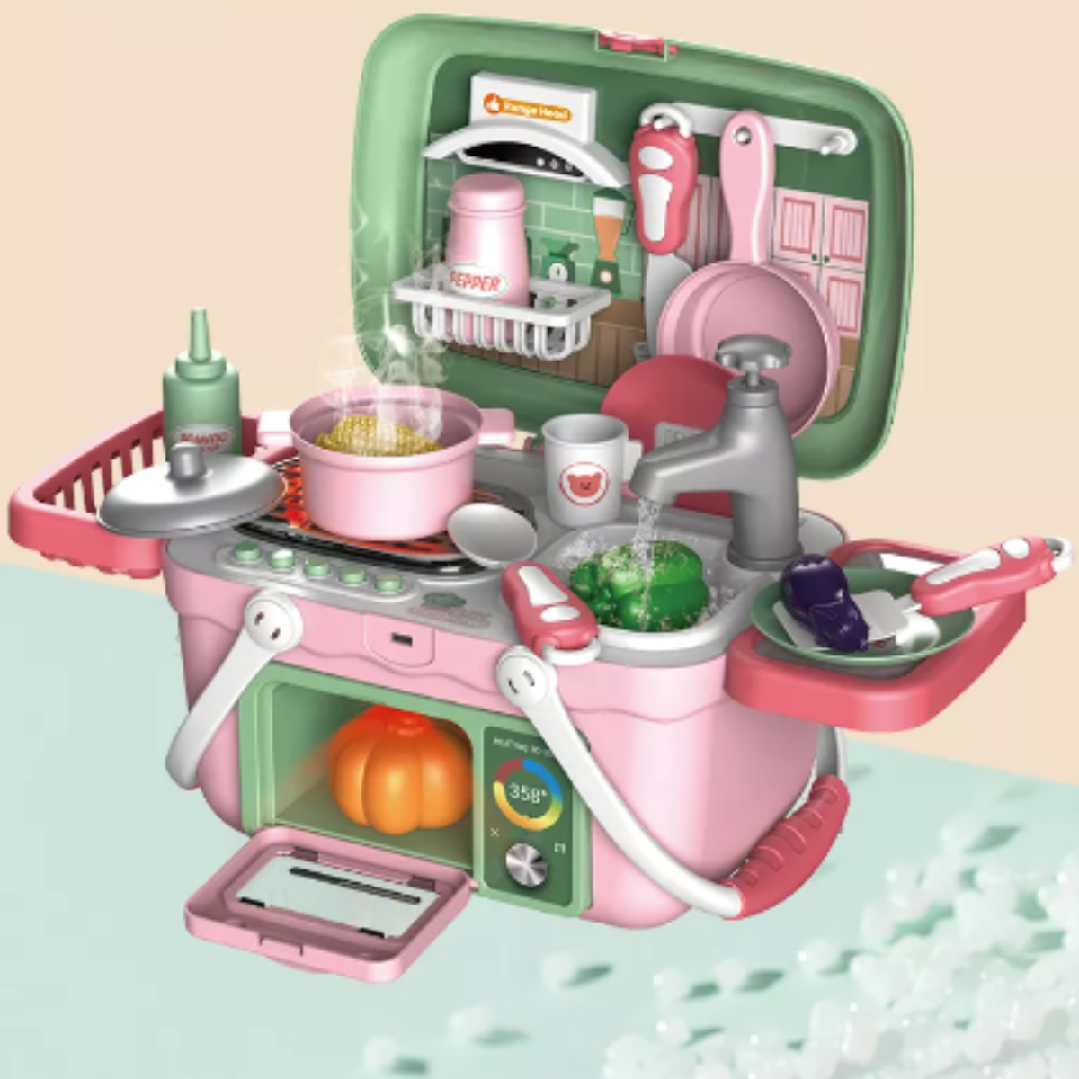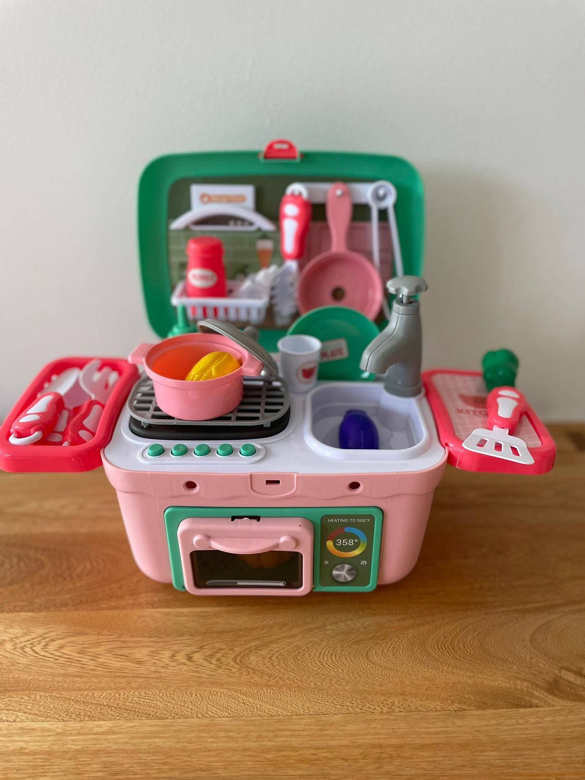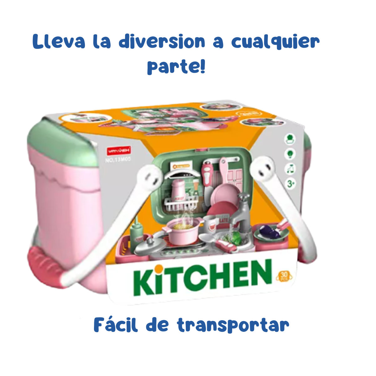 Set de cocina portátil que puedes llevar a todos lados. Diviértete con este practico set de juguete, con funciones que asemejan una cocina real.