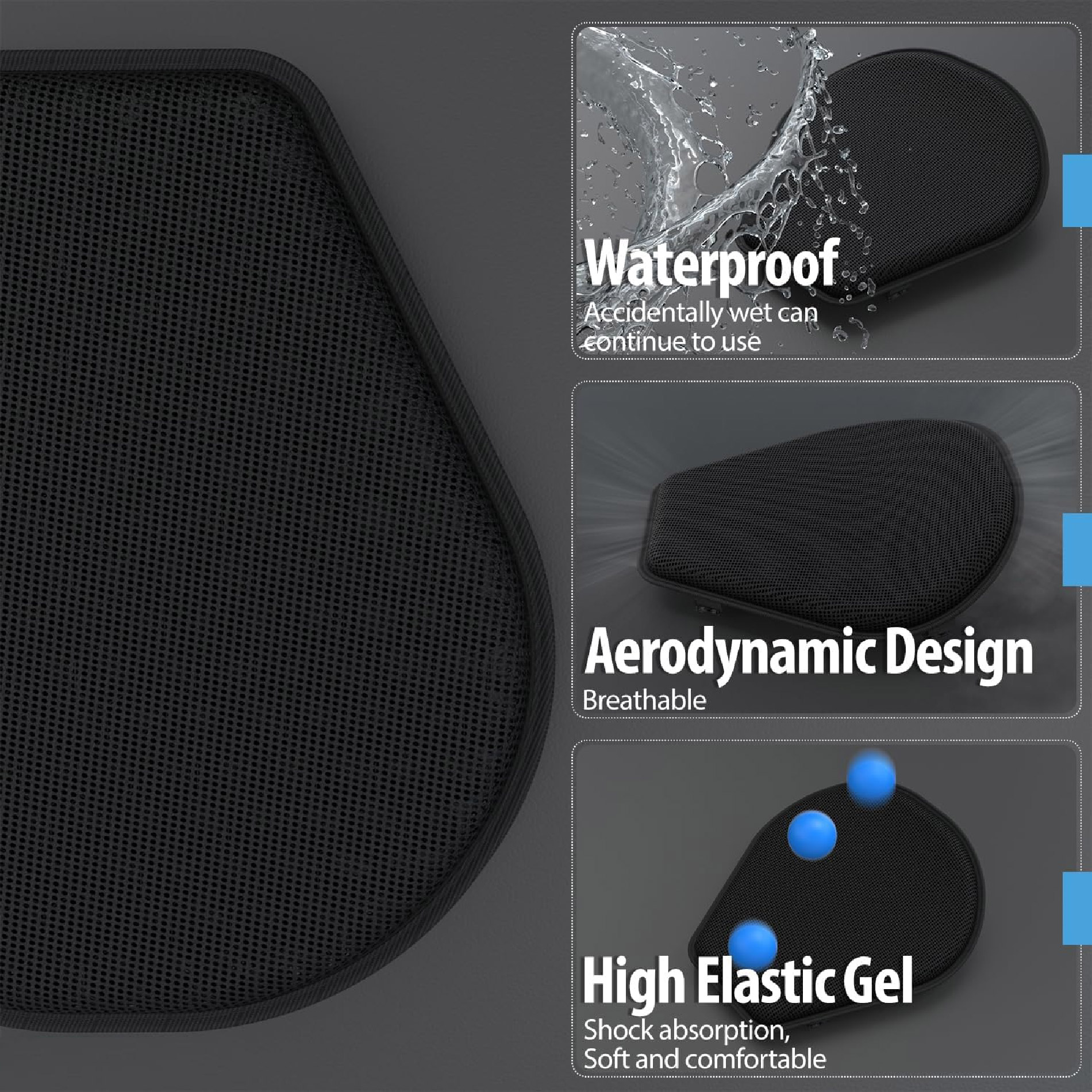 Secado rápido e impermeable: Debido al diseño de panal, el agua no se queda en el cojín del asiento. Incluso si llueve, el cojín del asiento se seca rápidamente para mejorar la comodidad.