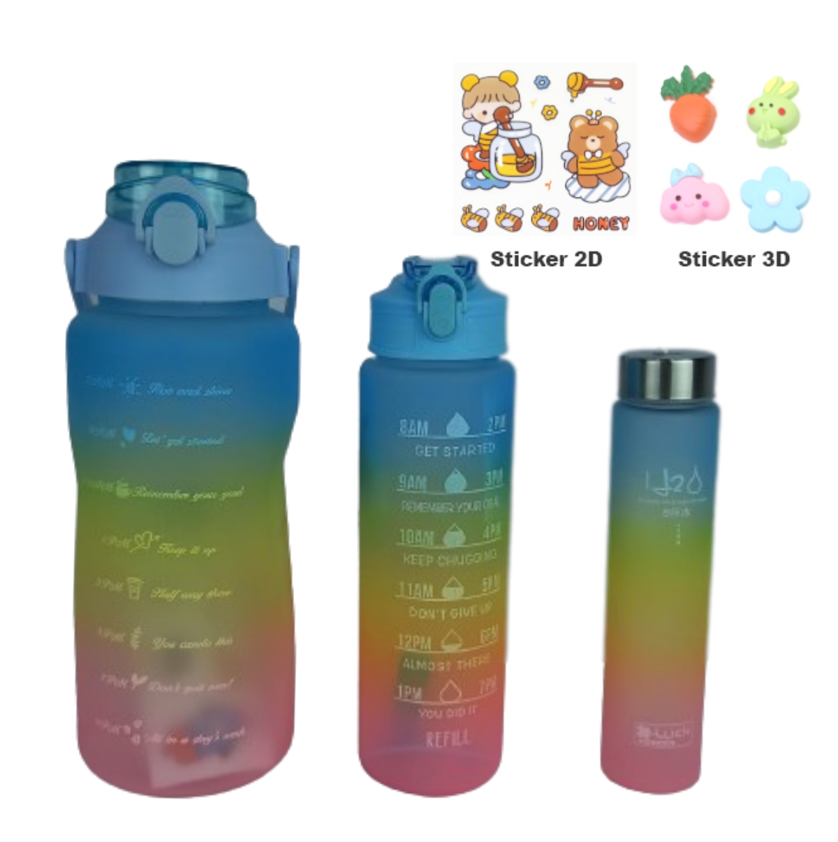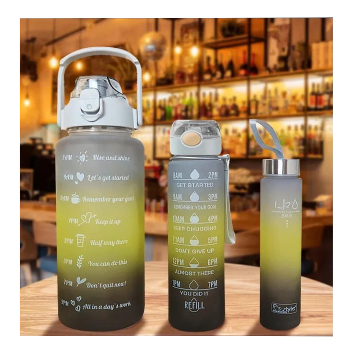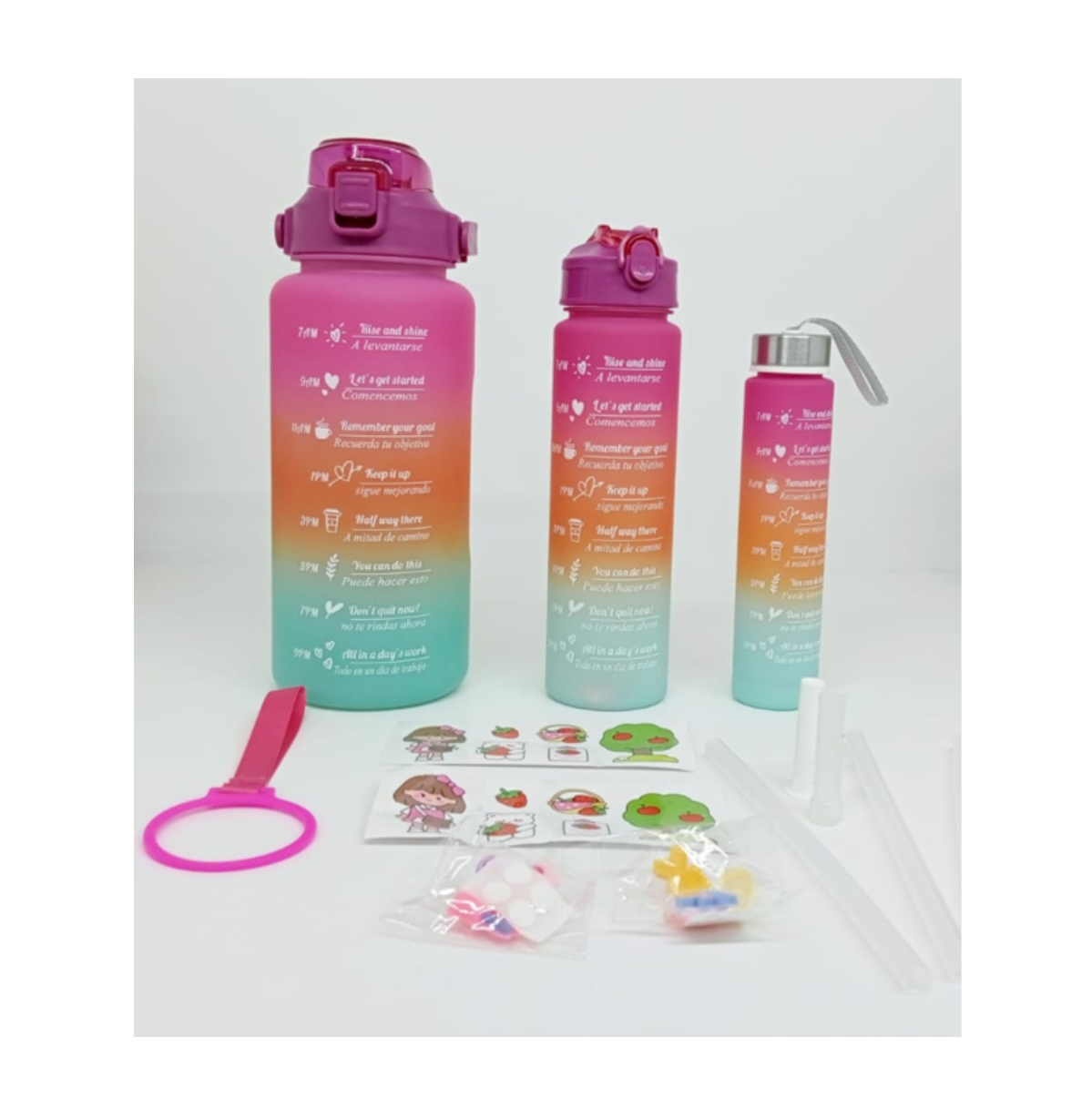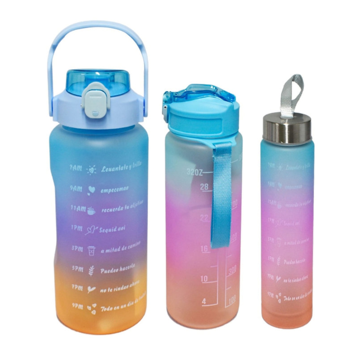 Botella Deportiva 3 piezas con capacidad de 2000ml, 1000ml y 330ml. Con cubierta de rebote, una prueba de fugas y con bello diseño Motivacional.