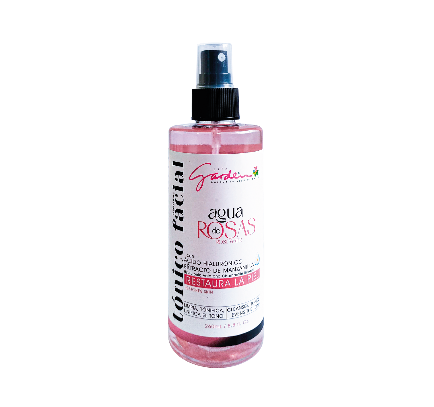 Facial Agua de Rosas, está compuesta por ingredientes exclusivos y naturales ricos en nutrientes que balancean los niveles de hidratación para mantener una piel hidratada, suave y tersaExtracto de Rosas: con vitaminas B, C y E, protege, restaura e hidrata, elimina impurezas, retrasa el envejecimiento prematuro, refresca, ilumina y unifica el tono de la piel, otorgando un aspecto radiante y saludable.Extracto de Manzanilla: limpia, tonifica, suaviza, reduce los poros, disminuye las ojeras, ayuda a disminuir el acné, repara la piel y elimina suavemente las impurezas.Ácido Hialuronico: aporta una apariencia saludable a la piel, permite la hidratación de forma natural ya que retiene el agua en la epidermis, manteniendo la correcta estructura de la piel. Facilita la reparación celular, disminuye las líneas de expresión.