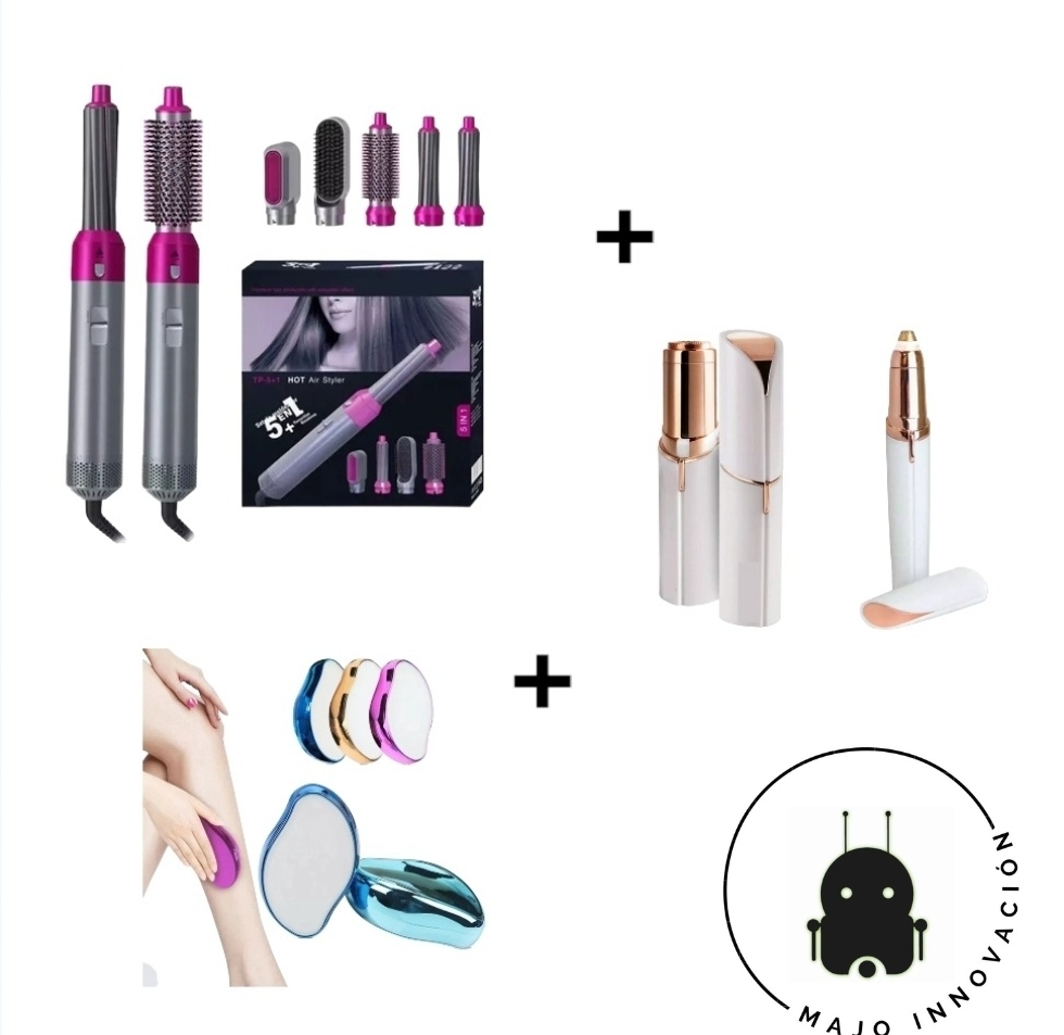 ¿QUIERES UN CABELLO PERFECTAMENTE PEINADO Y ESTILIZADO? NUESTRO SET DE BELLEZA ES TU SOLUCIÓN DEFINITIVA. DISEÑADO PARA SATISFACER TODAS TUS NECESIDADES DE PEINADO Y DEPILACIÓN SIN DOLOR EN UN SOLO CONJUNTO, ESTE KIT REVOLUCIONARÁ TU RUTINA DE BELLEZA Y TE PERMITIRÁ CREAR LOOKS DE SALÓN EN LA COMODIDAD DE TU HOGAR.