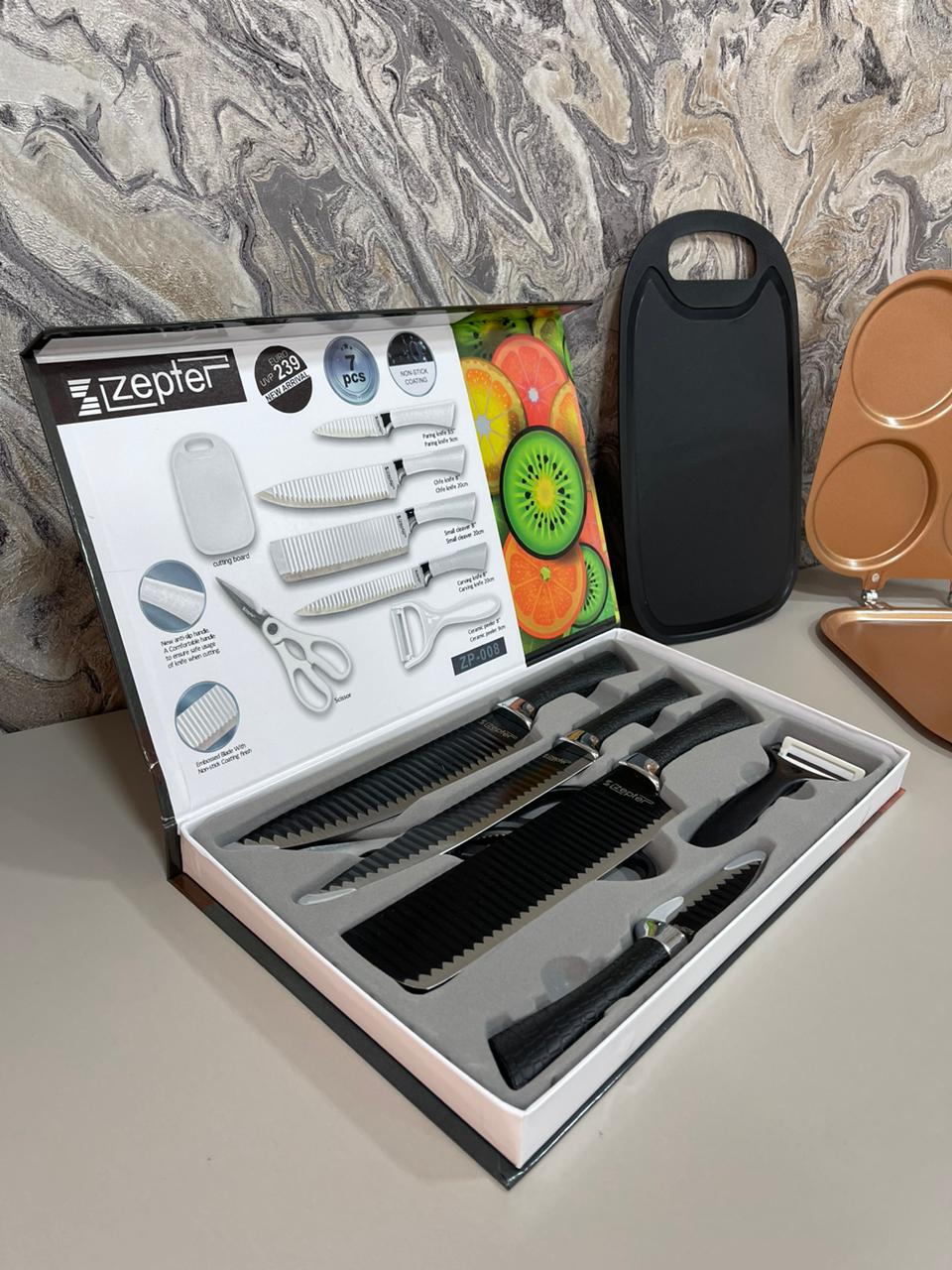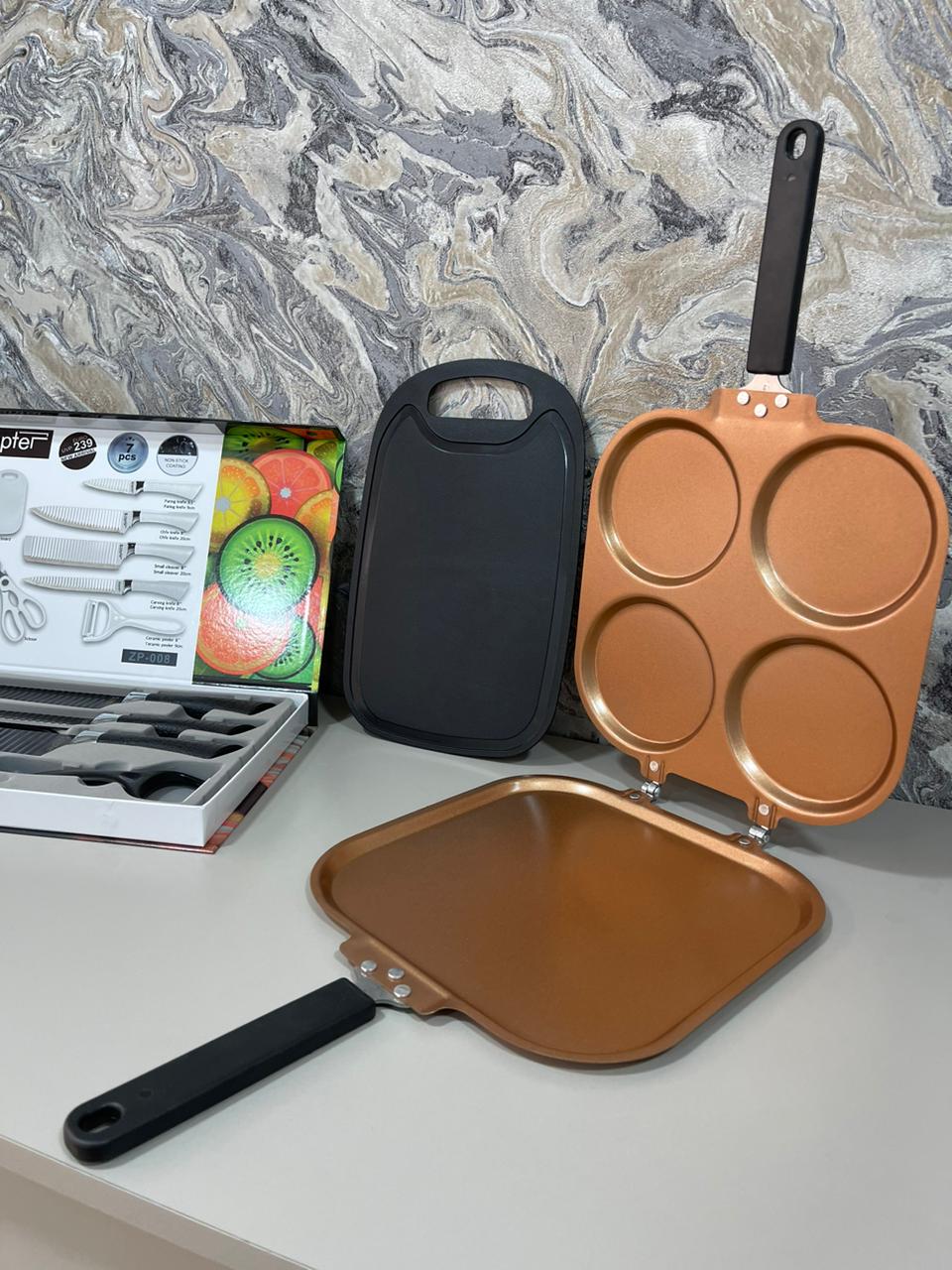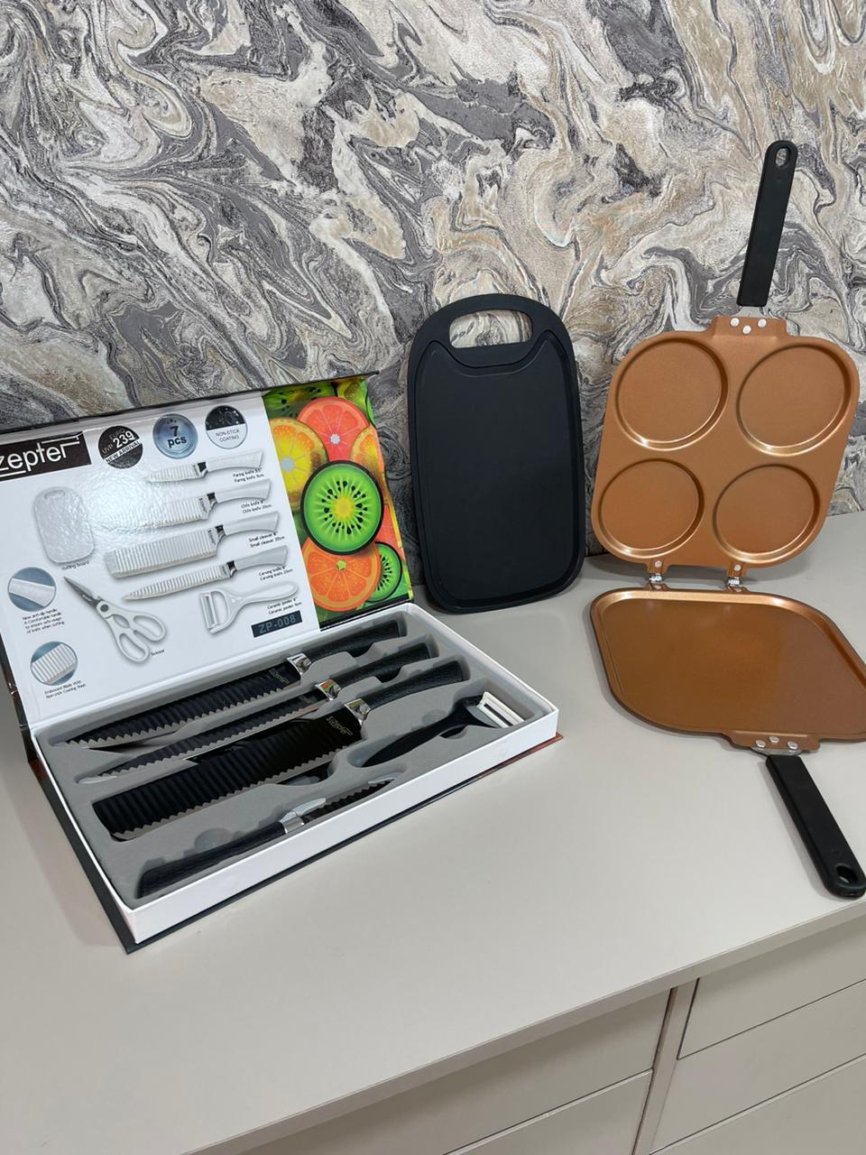 set de cubiertos de 7 piezas con tabla de picar y sarten 4 compartimientod
