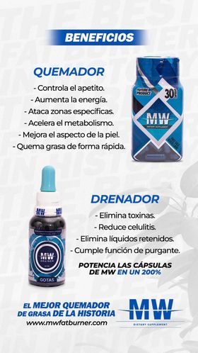 Quieres bajar de peso y buscas la mejor opción que no ponga en riesgo tu salud? Pues con nuestro sólido Combo MW (Quemador + Drenador) consigue no solo quemar grasa sino también eliminar las toxinas en tu cuerpo. Pero, ¿Cómo se complementan? Mientras nuestras cápsulas lo ayudan a adelgazar, el drenador le permite aumentar la efectividad en un 200% ejerciendo su poder al estimular la función renal.