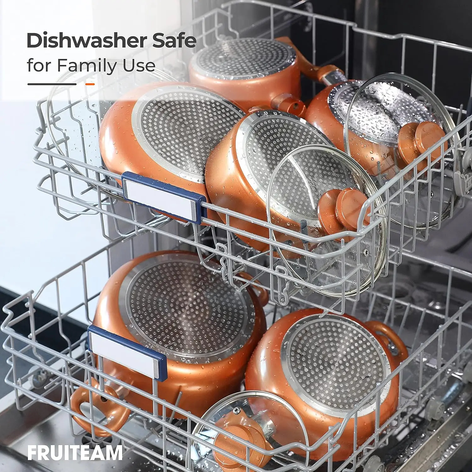 Este juego de utensilios de cocina de cobre es adecuado no solo para lavar a mano, sino también para lavavajillas; asegúrate de que se seque completamente después del lavado para evitar que el agua quede en el mango; apto para horno e inducción hasta 500 °F, tapas de vidrio seguras hasta 300 °F