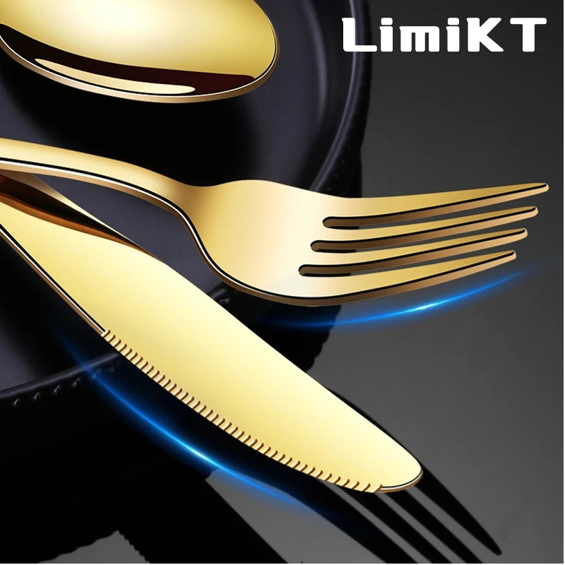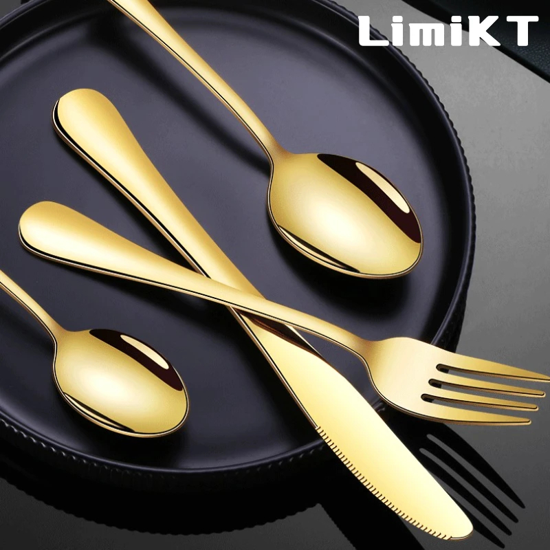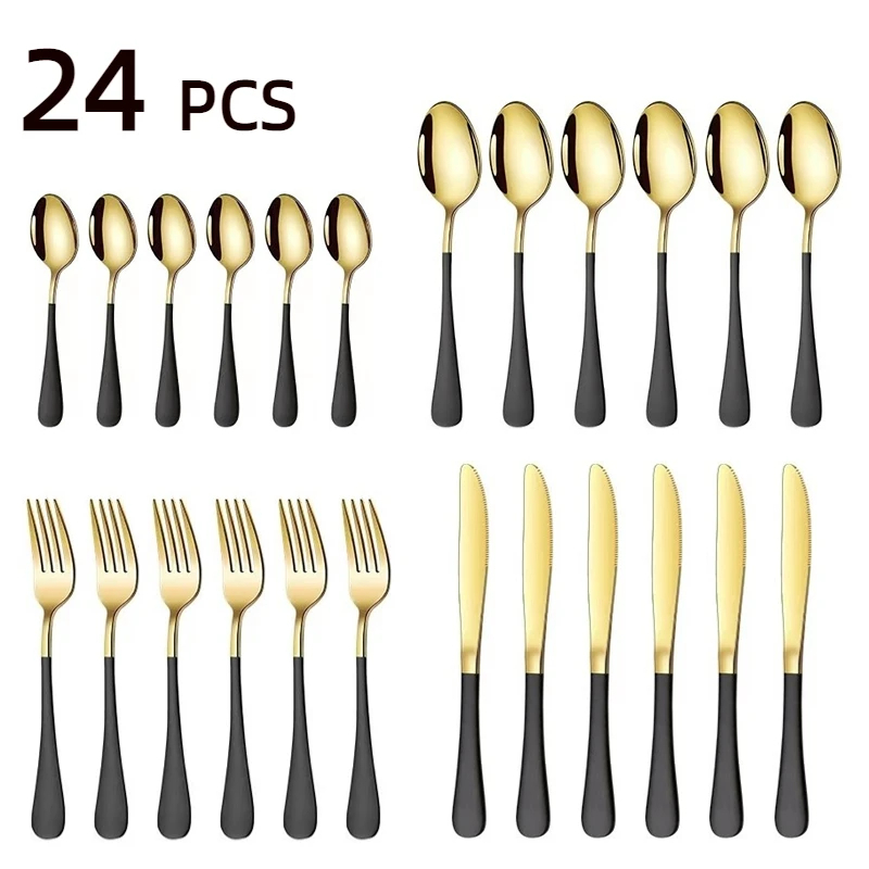 Con este set de cubiertos puedes cubrir hasta 6 puestos, Incluye cucharas grandes, cucharas de té, tenedores y cuchillos, todos fabricados en acero inoxidable con elegantes detalles en color dorado.