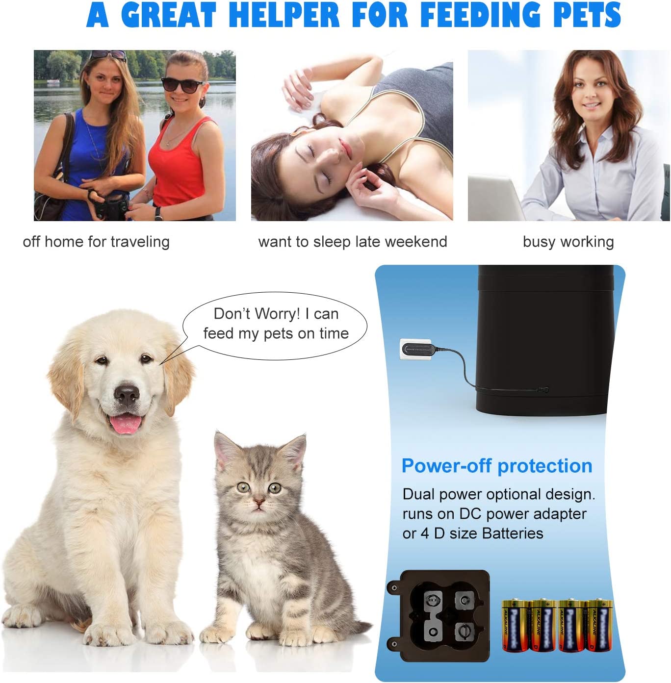 Fuente de alimentación dual: Las baterías para el comedero automático pueden durar de 1-3 meses (Baterías NO INCLUIDAS). El comedero automático puede funcionar con el adaptador de corriente y con las baterías que cumplen una función de respaldo. En caso de un corte de energía, el alimentador continuará funcionando con 4 baterías de tamaño D para asegurar que su mascota nunca se pierda una comida.