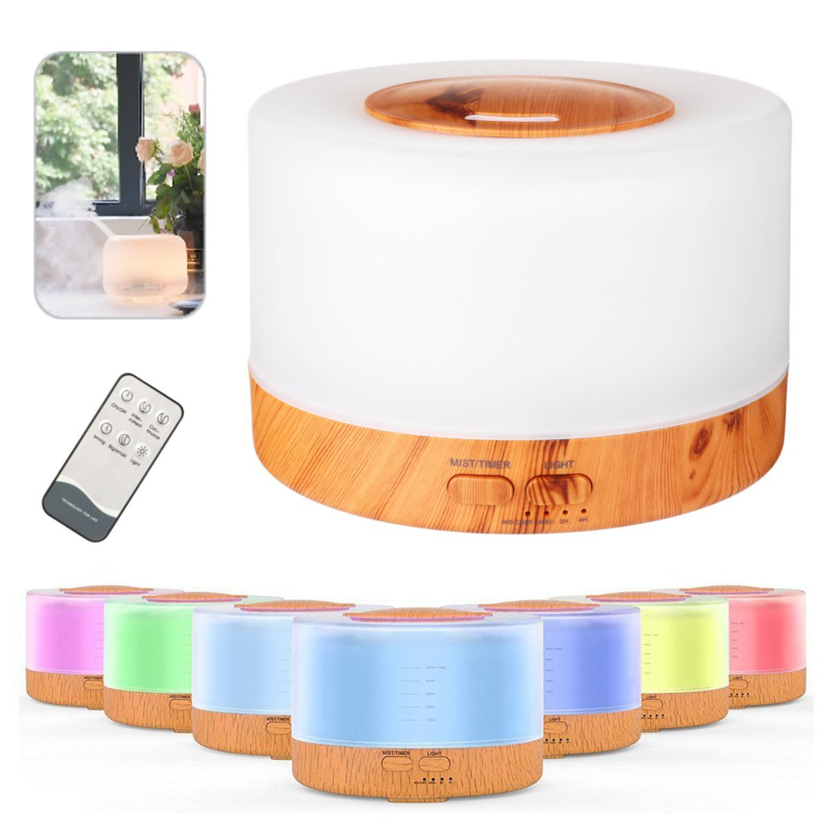 Hermoso difusor aromas tv benice con terminados tipo madera + control remoto, con capacidad de 500 ml: 4 en 1: humidificador, aroma-terapia, purificador aire y lampara con luz led colores…