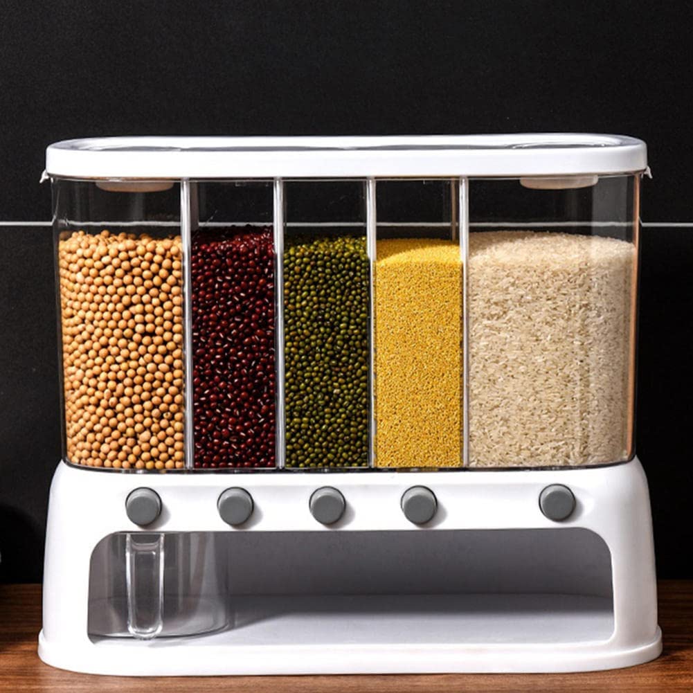 Dispensador de pellets de 5 compartimentos, Hay un compartimento desmontable en el medio para aumentar los tipos de almacenamiento, viene con 1 taza para un fácil acceso. Se puede utilizar para almacenar arroz, granos, semillas, comida para mascotas, perlas aromáticas de lavandería, detergente en polvo y otros granos sólidos pequeños, no apto para cualquier forma líquida de suministros de lavandería