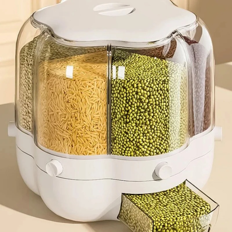Dispensador de arroz y granos (puede contener 20 a 25 libras): recipiente de almacenamiento de alimentos giratorio de 360°, dispensador de alimentos secos de 6 compartimentos con tapa, almacenamiento.