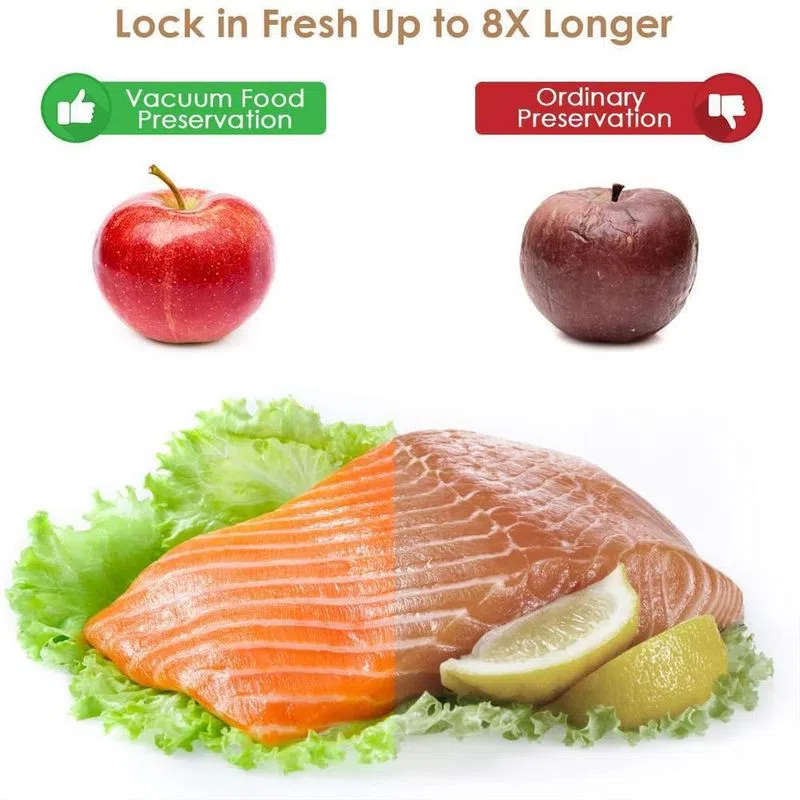- El envasado al vacío prolonga la vida útil de los alimentos al eliminar la mayor parte del aire de los contenedores y evita que el aire fresco se escape a los contenedores sellados, reduciendo así oxidación. El envasado al vacío ayuda a preservar el sabor y la calidad general