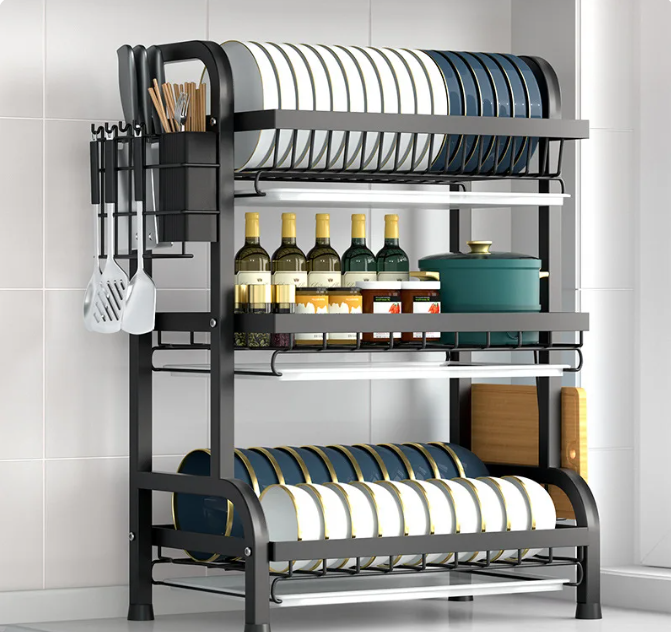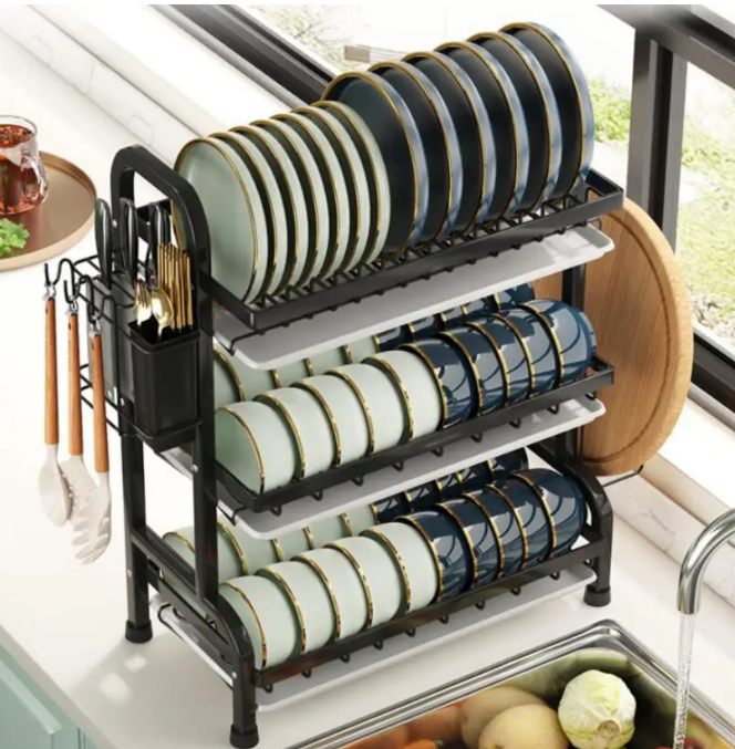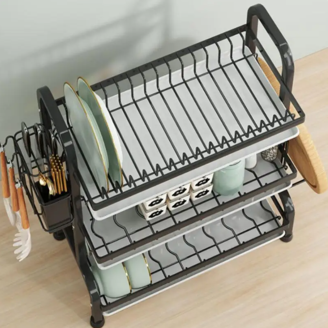 El escurridor de platos para cocina con diseño de 3 niveles satisface las necesidades básicas de la familia. El espacio razonable se organiza para dar una sensación de una encimera ms abierta. Mide cuidadosamente la altura entre el armario y la encimera antes de hacer una elección, especialmente reserva espacio para la altura de la placa.