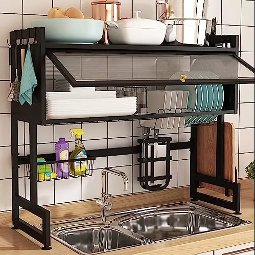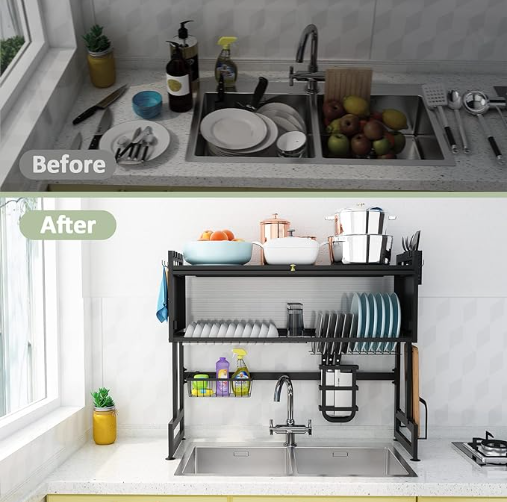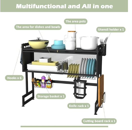 Diseño robusto nuestro excelente escurridor para secar sobre el fregadero está hecho de acero inoxidable de grado superior y tiene un elegante revestimiento negro. Fue creado específicamente para el uso sobre el fregadero. Esto le da una capacidad inigualable para soportar cargas y resistencia a la humedad lo que le permite tolerar la humedad que se encuentra en la encimera del fregadero de la cocina.