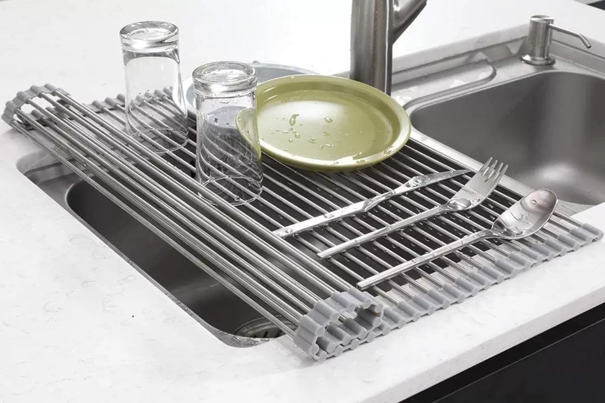 Escurridor enrollable de lavaplatos, hecho de Acero Inoxidable y silicona para mayor agarre. Ahorra espacio en tu cocina con este practico escurridor de platos.