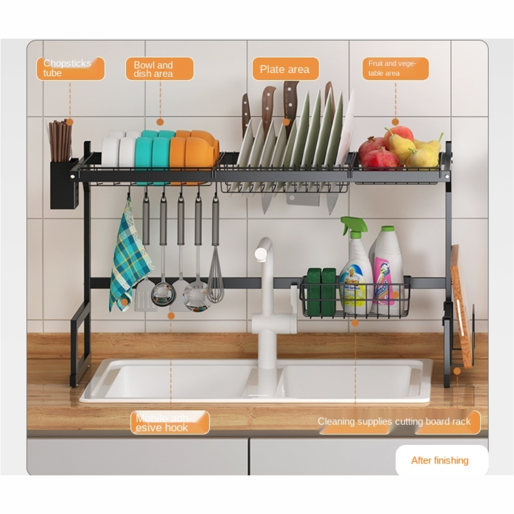 Se ajusta al 99% del fregadero, longitud ajustable: Diseño de producto exclusivo y una amplia gama de longitudes ajustables, adecuado para el 99% de los fregaderos individuales y dobles. Dimensiones del estante para platos: