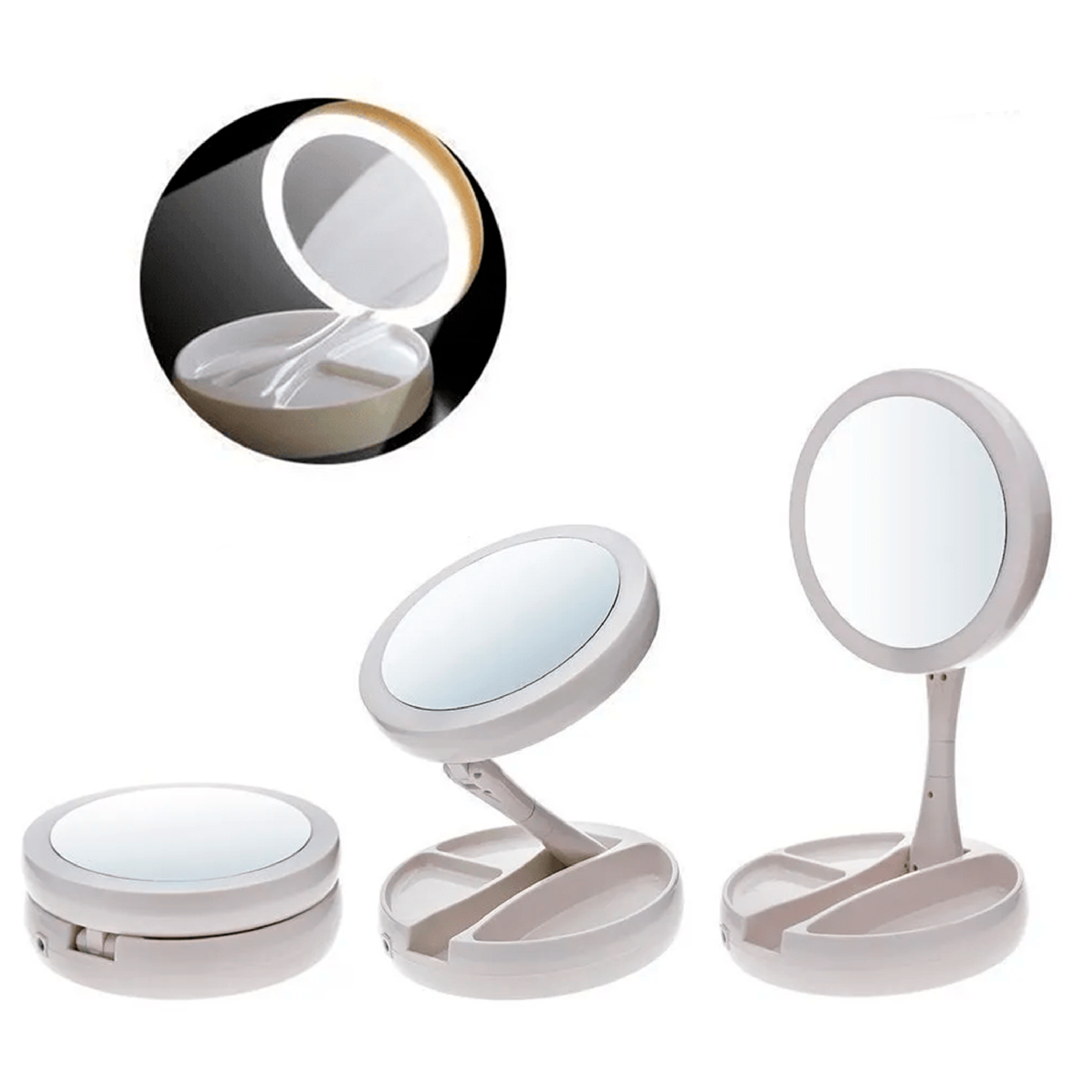 Se pliega y gira para un uso y almacenamiento fáciles. La luz Led súper brillante se ilumina en ambos lados para una iluminación perfecta de la imagen. Está hecho de vidrio sin distorsión. Este espejo gira a un poderoso espejo de aumento de 10x. Se extiende a una altura total de 29.5 cm, pero se pliega para un almacenamiento cómodo. Cuenta con un organizador incorporado para accesorios. Las luces led tienen una capacidad nominal de 31,000 horas. Es liviano y compacto para viajar. Se podrá mirar sin distorsión, nítido y claro , se pliega rápida y fácilmente. Funciona con cable USB o pilas AA |