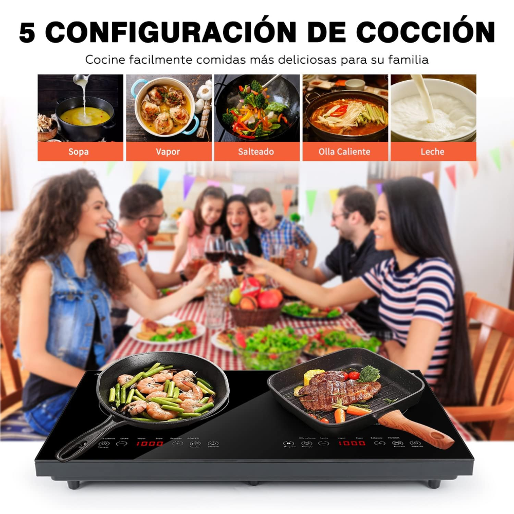 Modo de potencia y modo de temperatura. Los 2 quemadores en la Parrilla de Inducción Eléctrica cuentan con 9 niveles de temperatura que van desde 80-280°C, y 8 niveles de potencia configurados desde 100-1000W. Puede elegir el perfecto para el plato que cocina. No hay estrés para la estufa al calentar leche, fideos, freír, olla caliente. Para preparar deliciosos desayunos, almuerzos y cenas para sus familiares y amigos.
